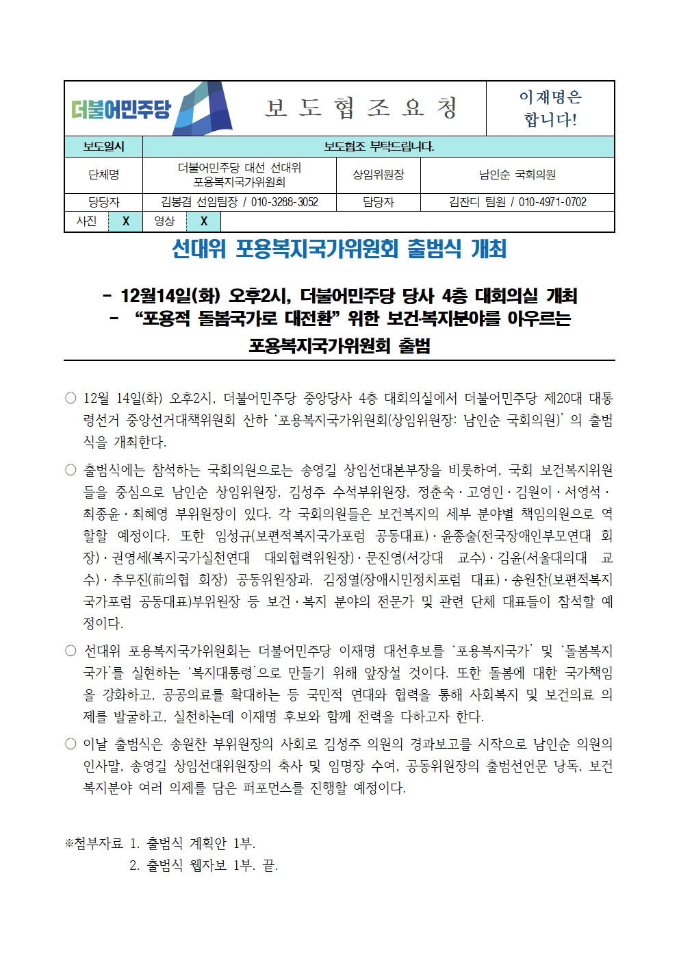 [보도자료] 더불어민주당 중앙선거대책위원회 포용복지국가위원회 출범식 개최
