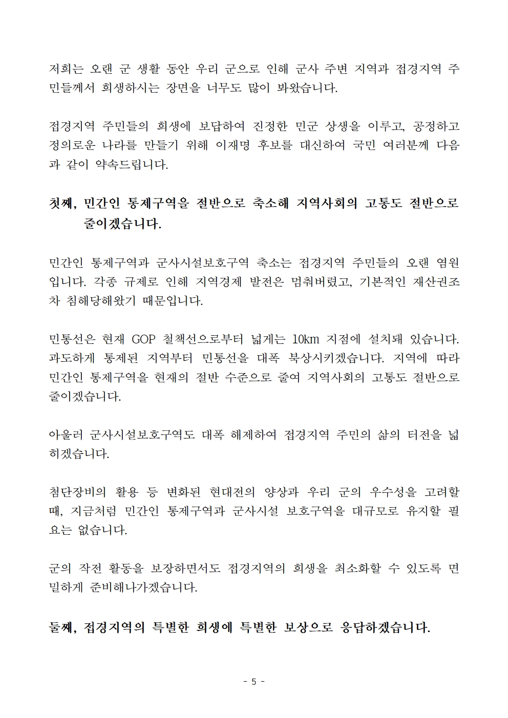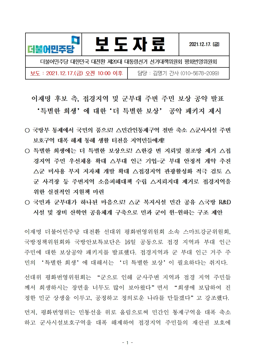 [보도자료] 더불어민주당 선대위 평화번영위원회, 접경지역 및 군부대 주변 주민 보상 공약 발표