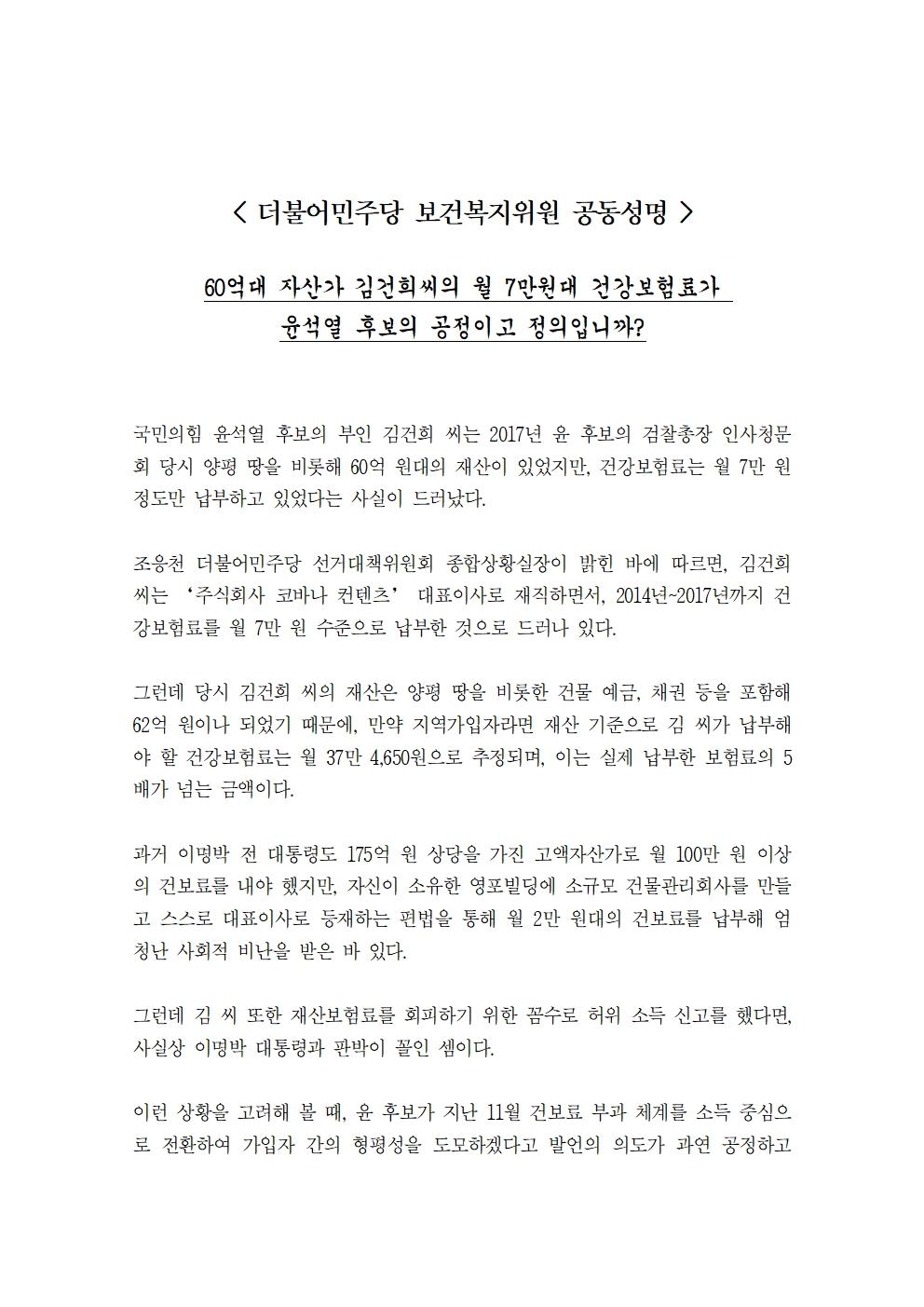 [성명서] 더불어민주당 보건복지위원, 60억대 자산가 김건희 씨의 월 7만원대 건강보험료가 윤석열 후보의 공정이고 정의입니까?