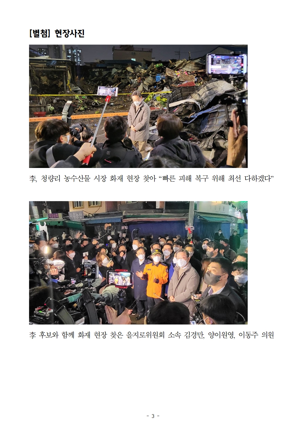 [보도자료] 더불어민주당 선대위 을지로위원회, 이재명 후보와 청량리청과물시장 화재 현장 방문