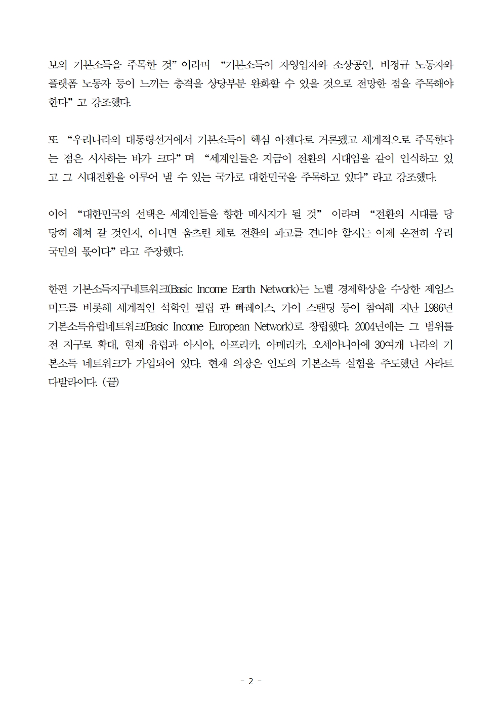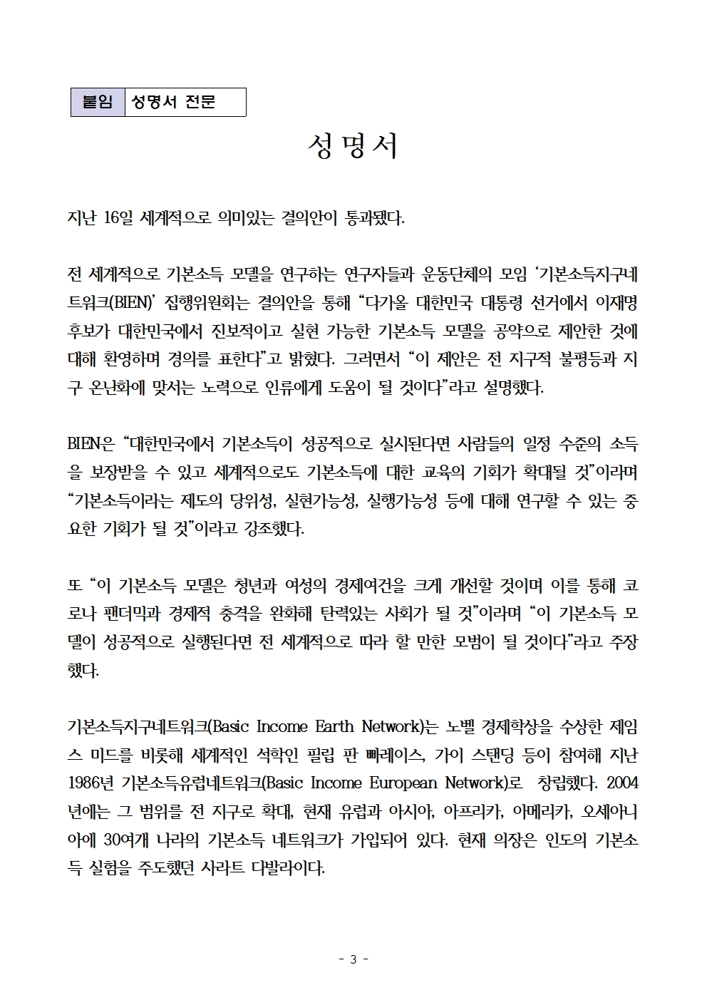 [보도자료] 더불어민주당 선대위 기본사회위원회, 기본소득지구네트워크 결의문 환영