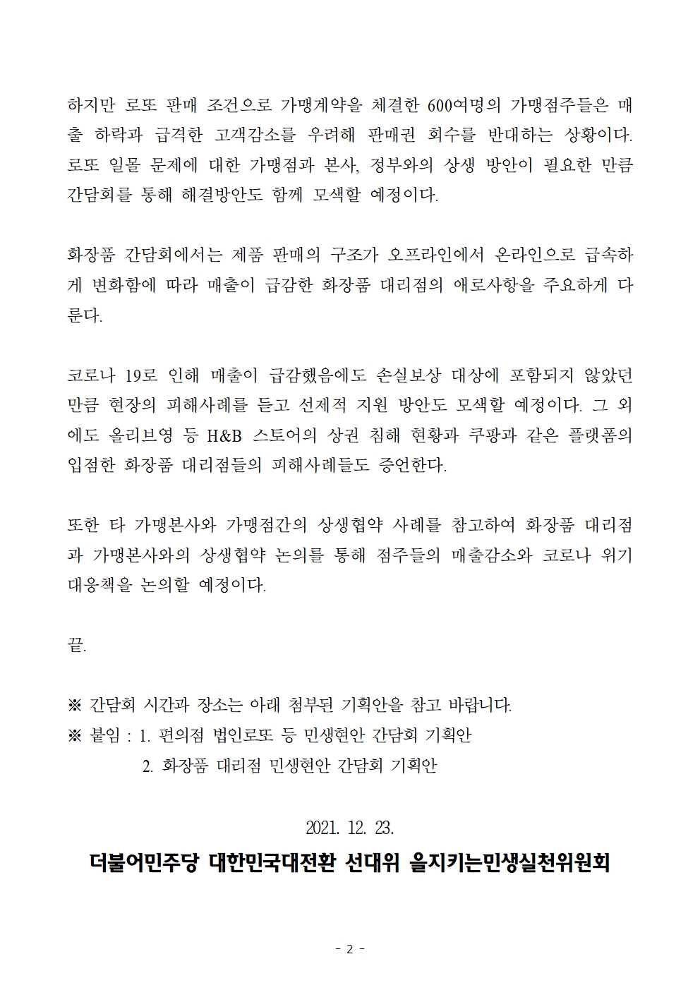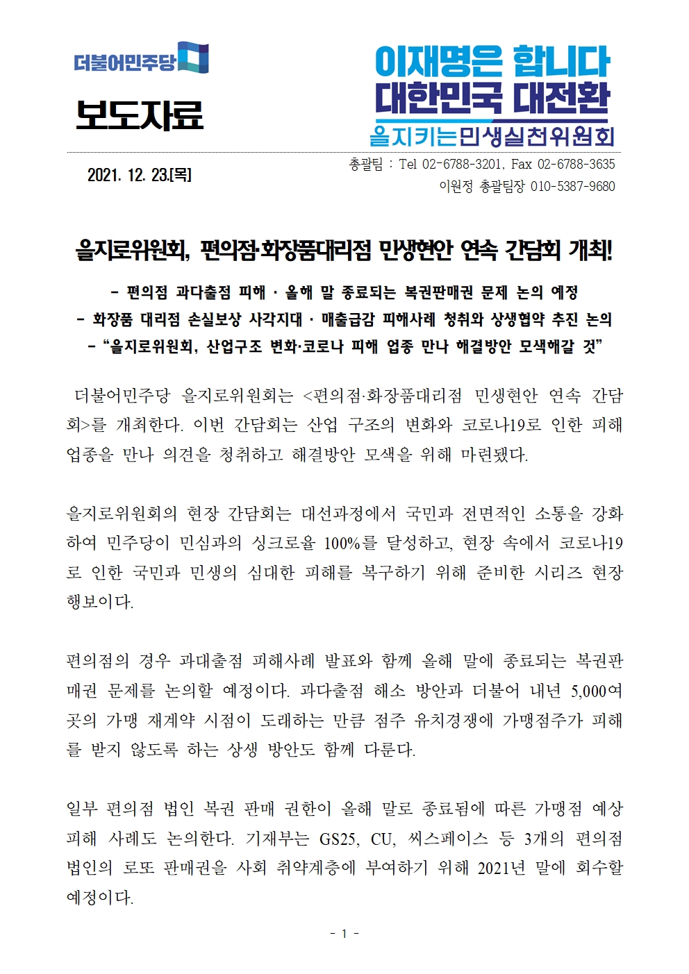 [보도자료] 더불어민주당 을지로위원회, 편의점·화장품대리점 민생현안 연속 간담회 개최
