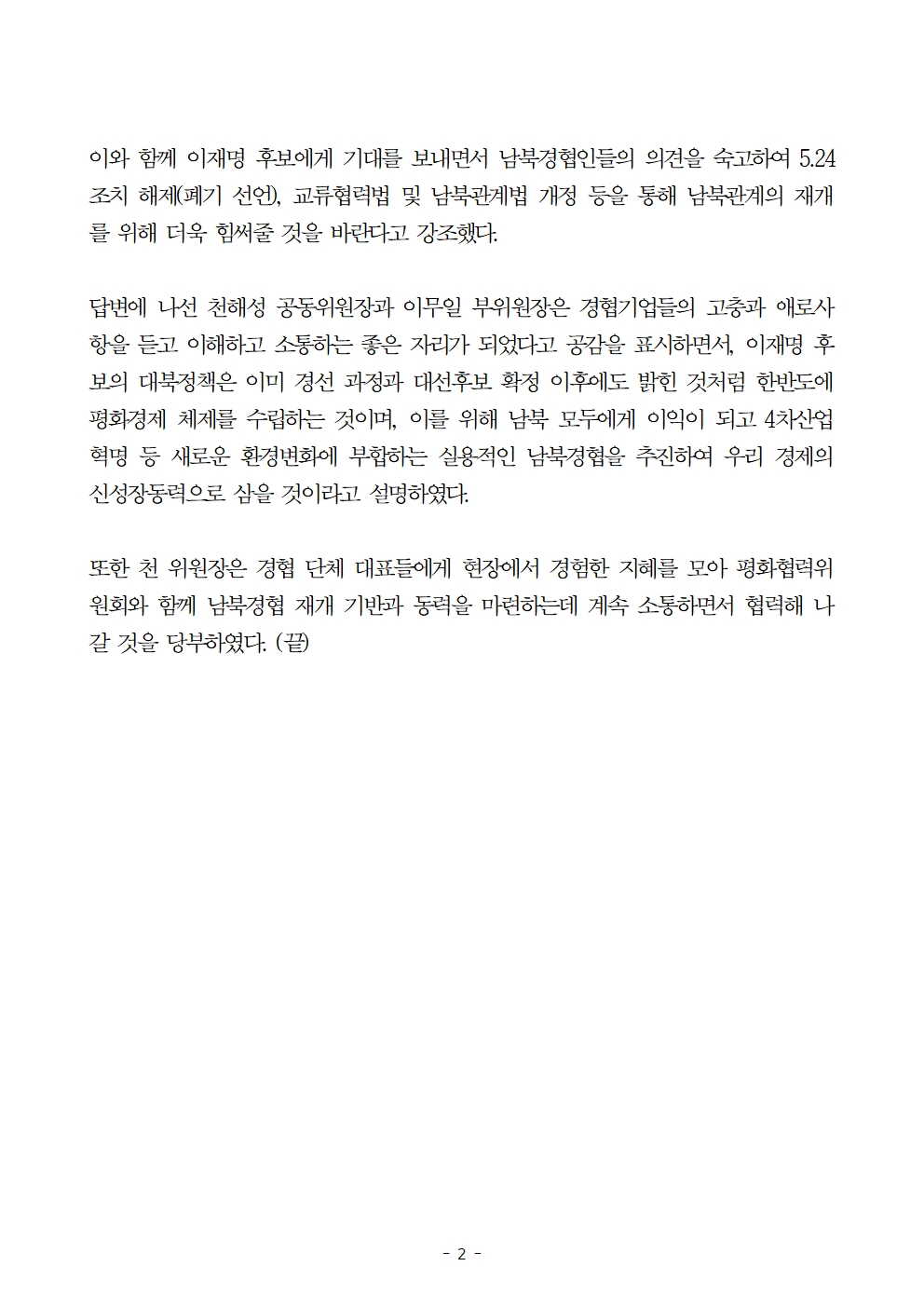 [보도자료] 더불어민주당 선대위 평화번영위원회 산하 평화협력위원회, 남북경협단체 간담회 개최