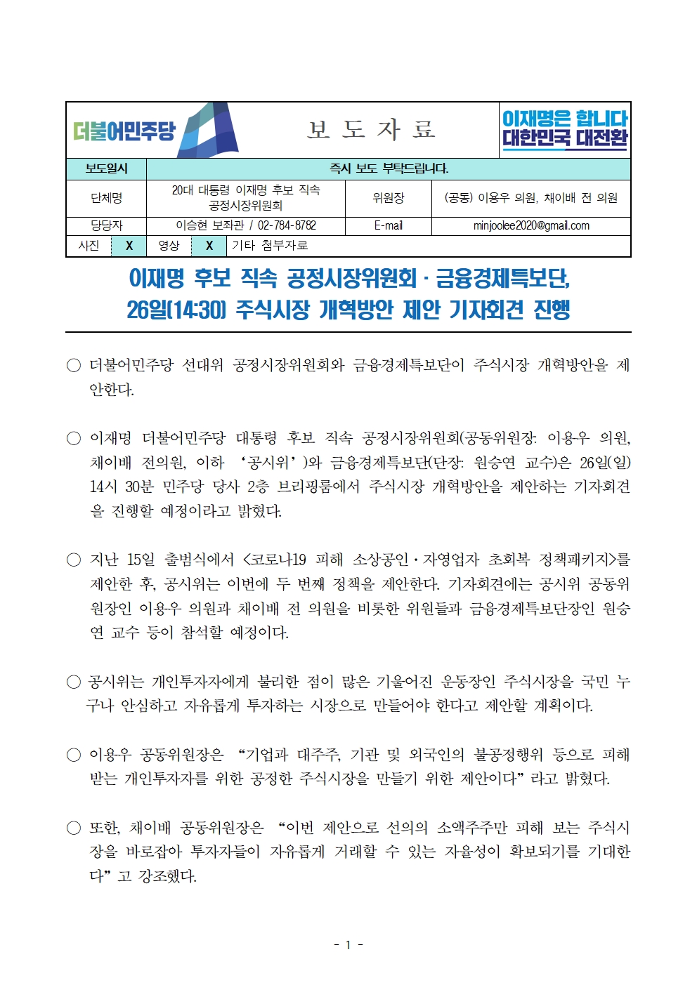 [보도자료] 더불어민주당 선대위 공정시장위원회·금융경제특보단, 주식시장 개혁방안 제안 기자회견