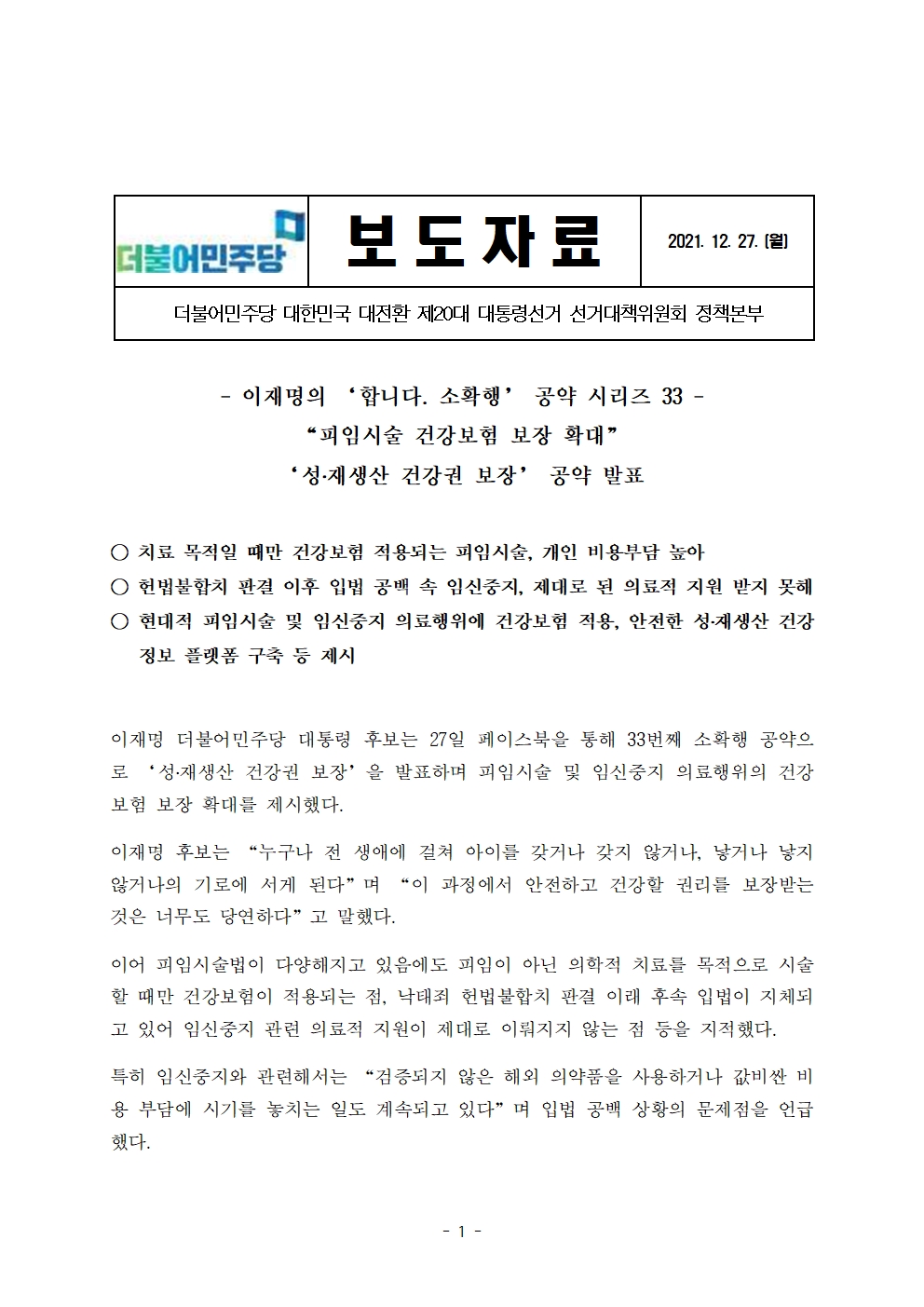 [보도자료] 더불어민주당 선대위 정책본부, '이재명의 합니다. 소확행 공약 시리즈 33' 성·재생산 건강권 보장 확대 공약