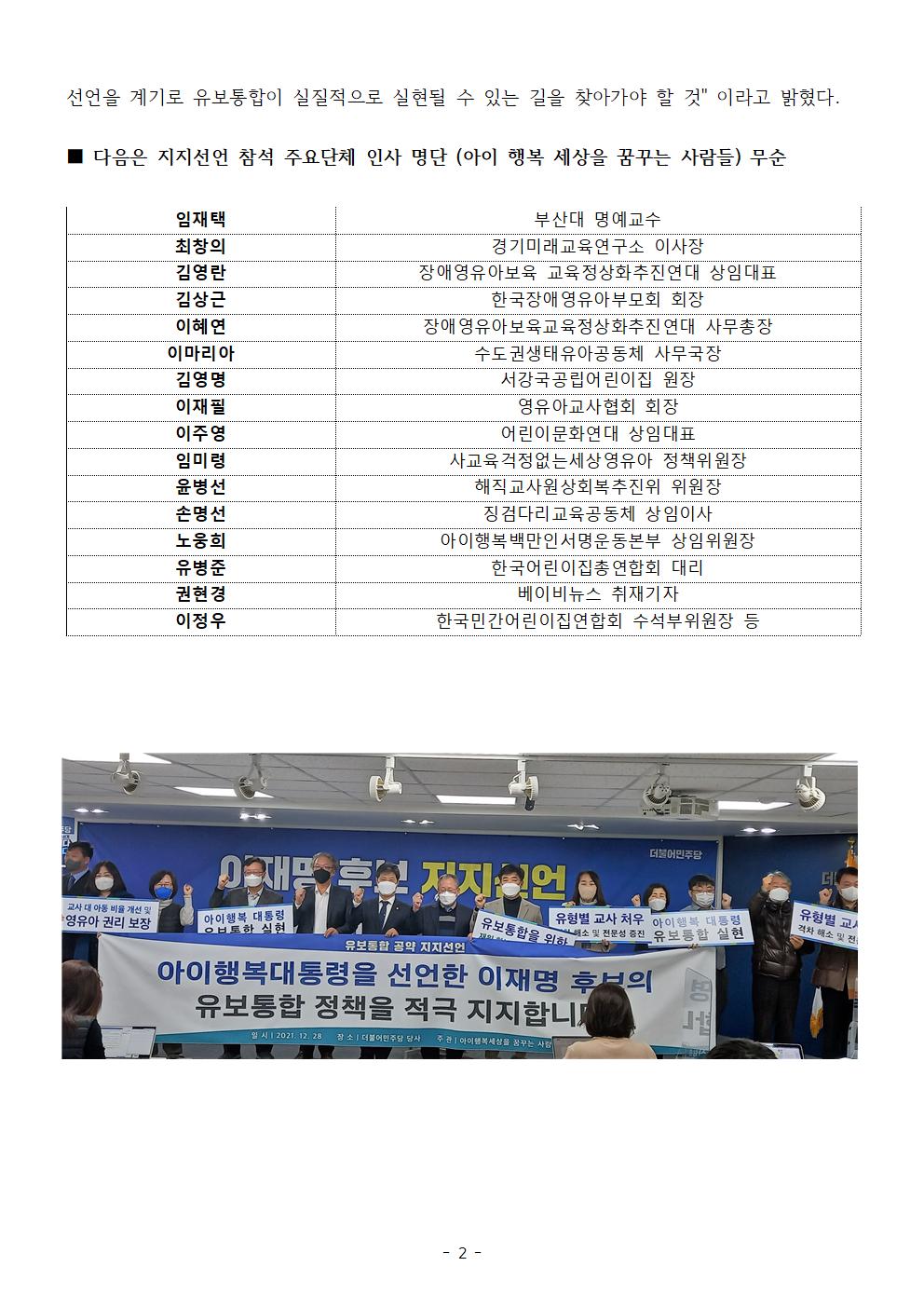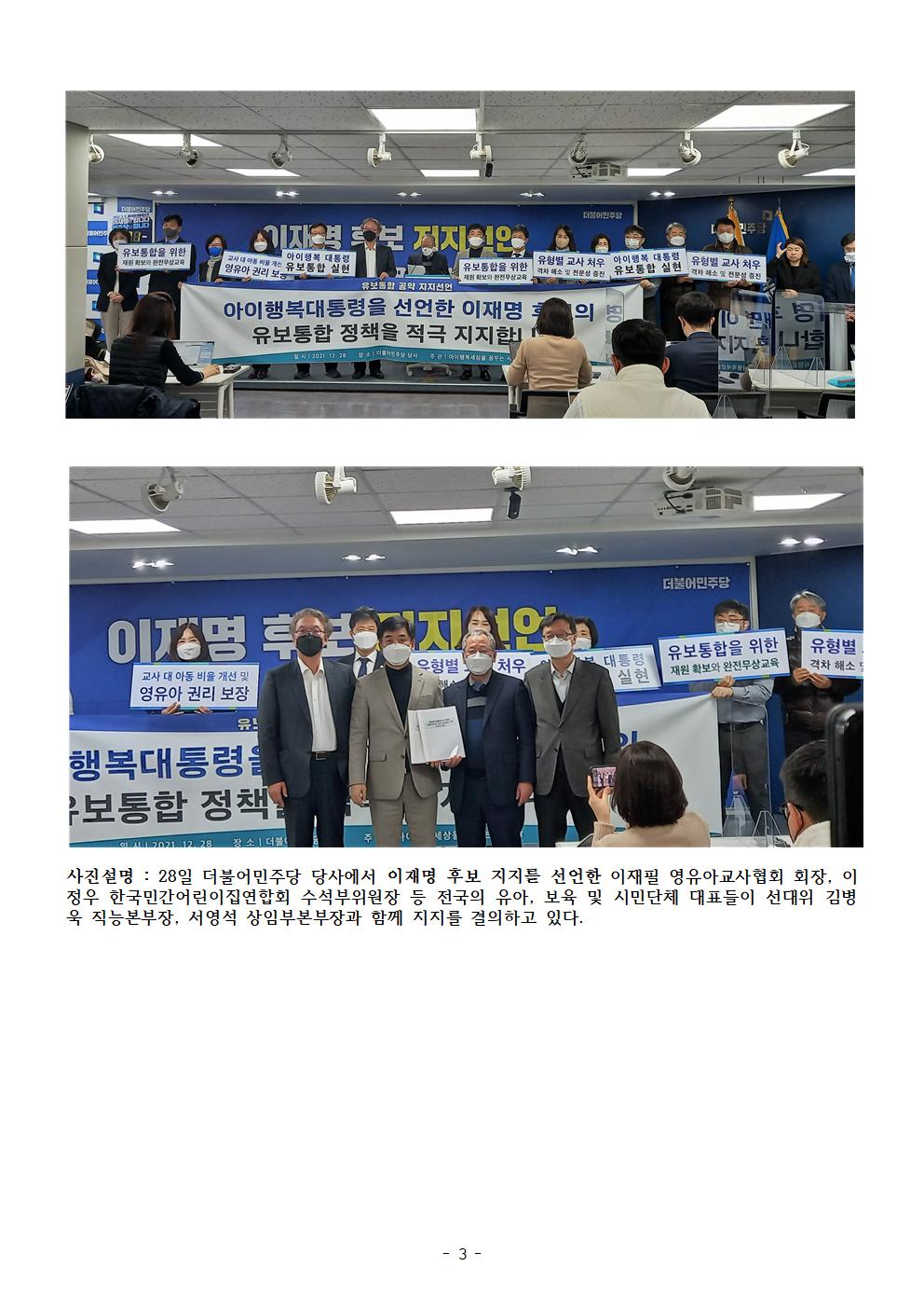 [보도자료] 더불어민주당 선대위 직능본부 이재명 후보 유보통합 공약 지지선언
