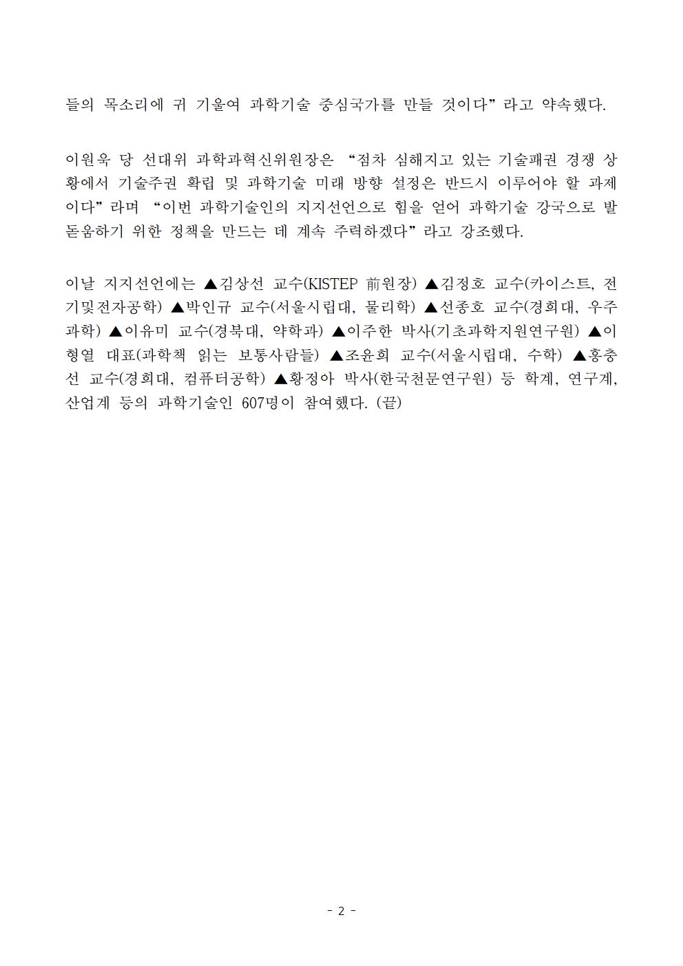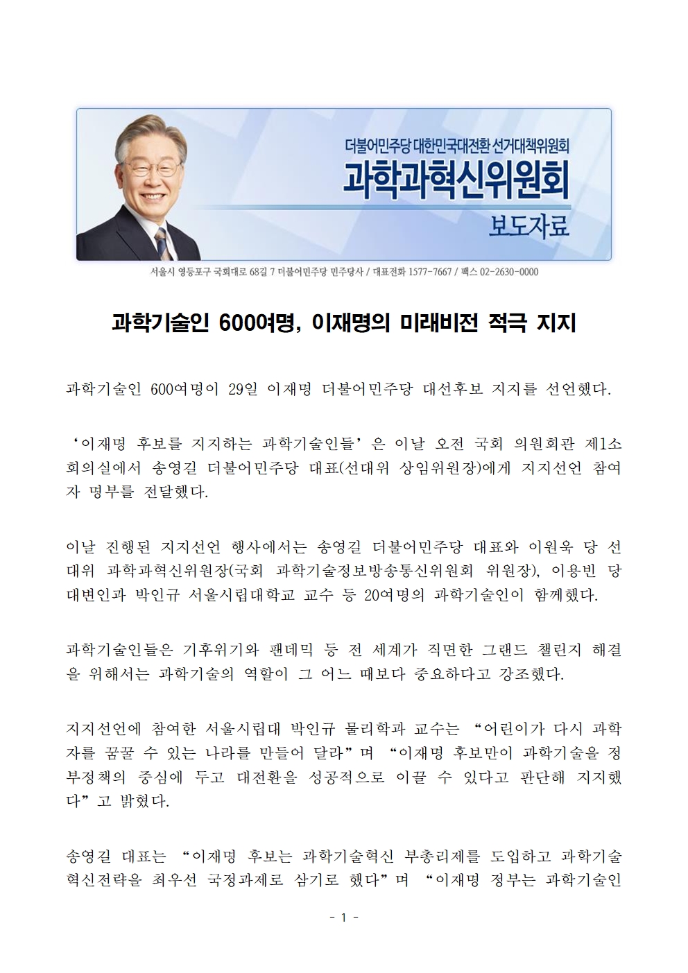 [보도자료] 더불어민주당 선대위 과학과혁신위원회, 과학기술인 600여 명 이재명의 미래비전 적극 지지 선언