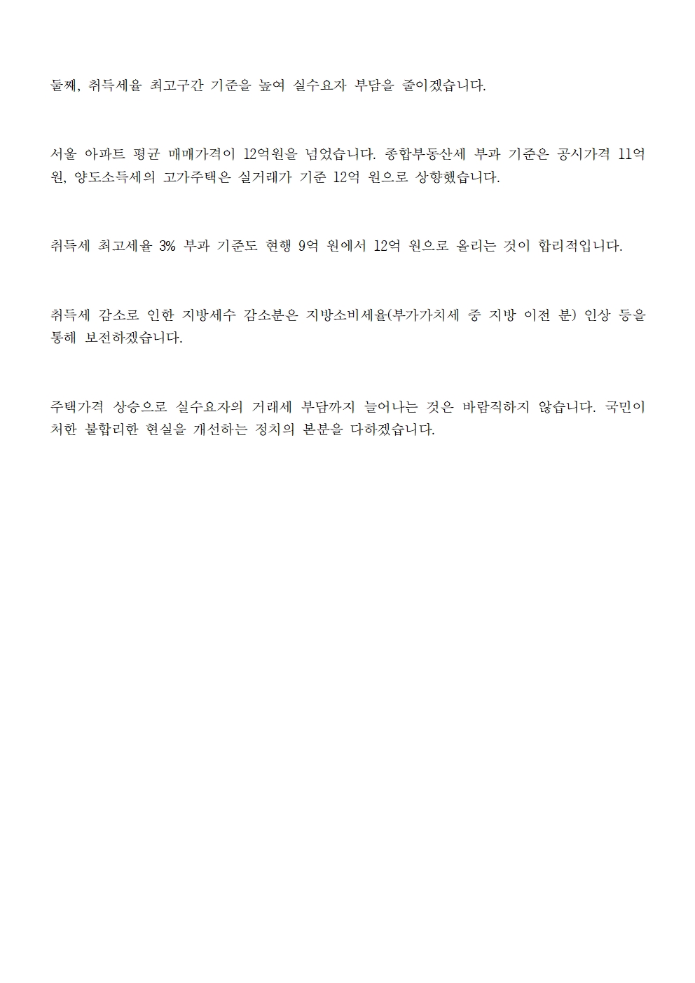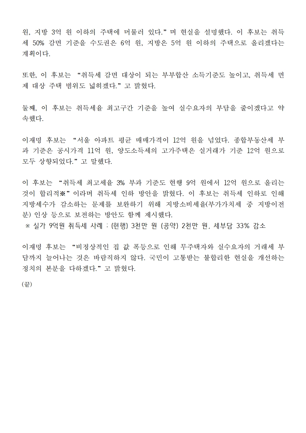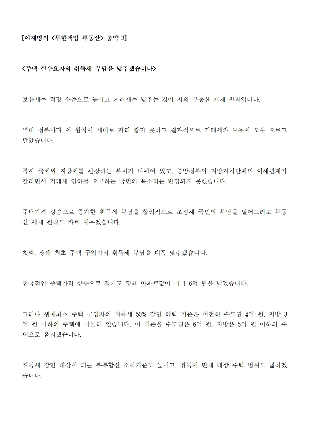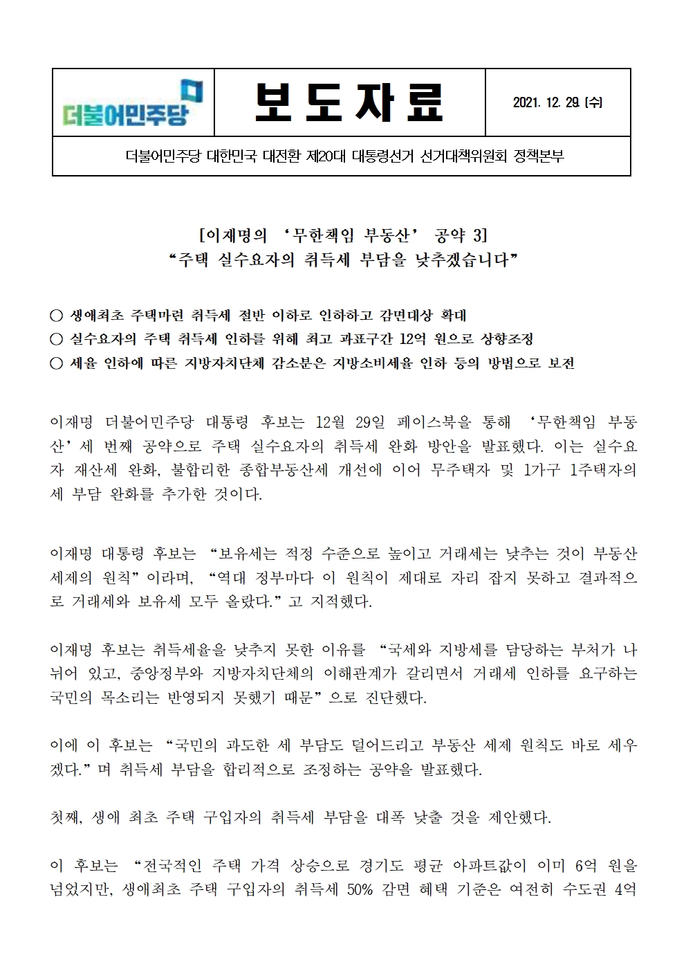[보도자료] 더불어민주당 선대위 정책본부, '이재명의 무한책임 부동산 공약 3' 주택 실수요자 취득세 완화 방안