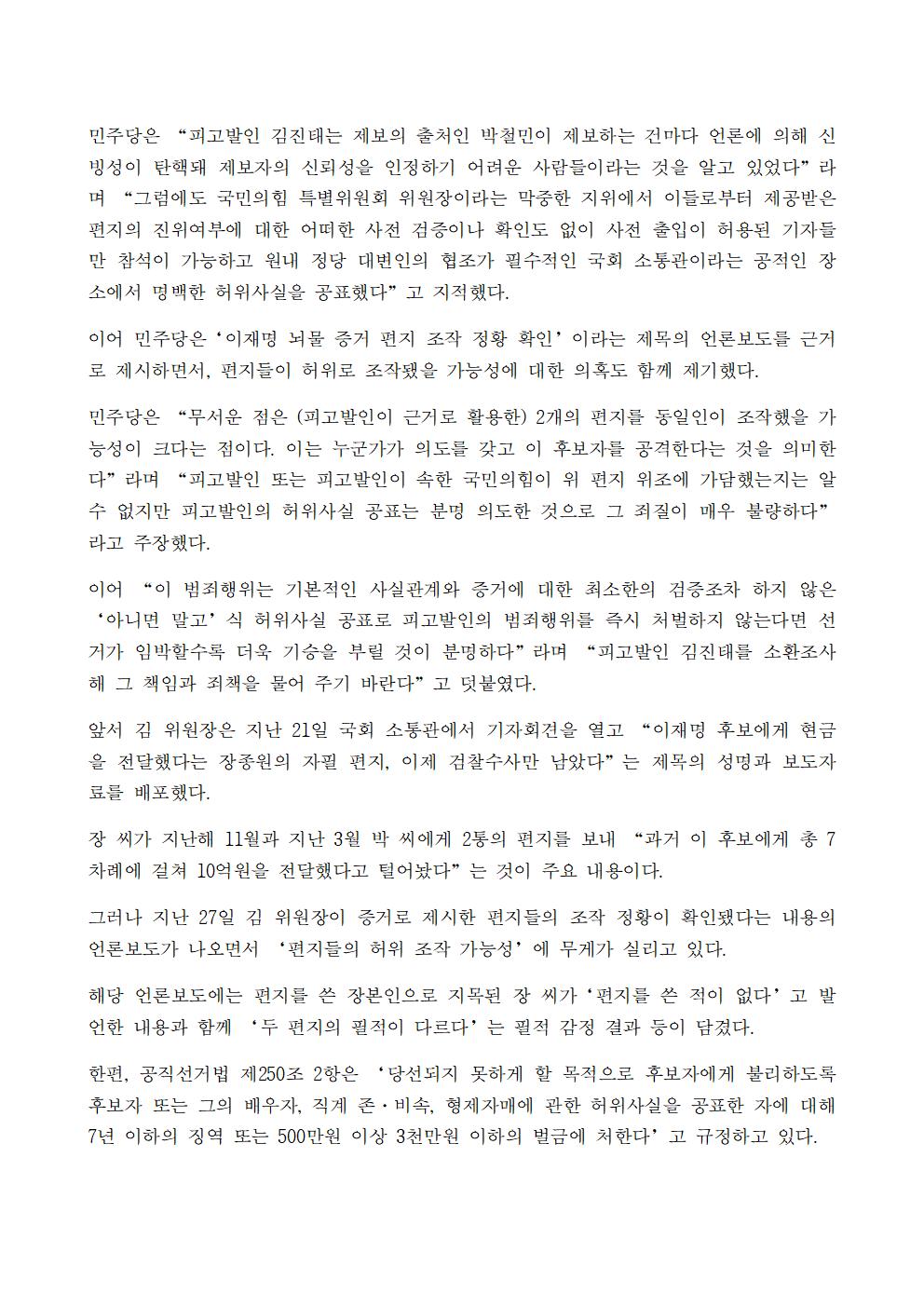 [보도자료] 더불어민주당 선대위 법률지원단 국민의힘 김진태 특위위원장 고발