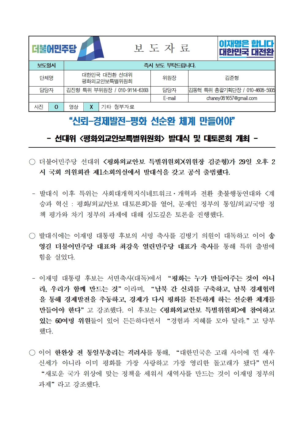 [보도자료] 더불어민주당 선대위 평화외교안보특별위원회, 발대식 및 대토론회 개최