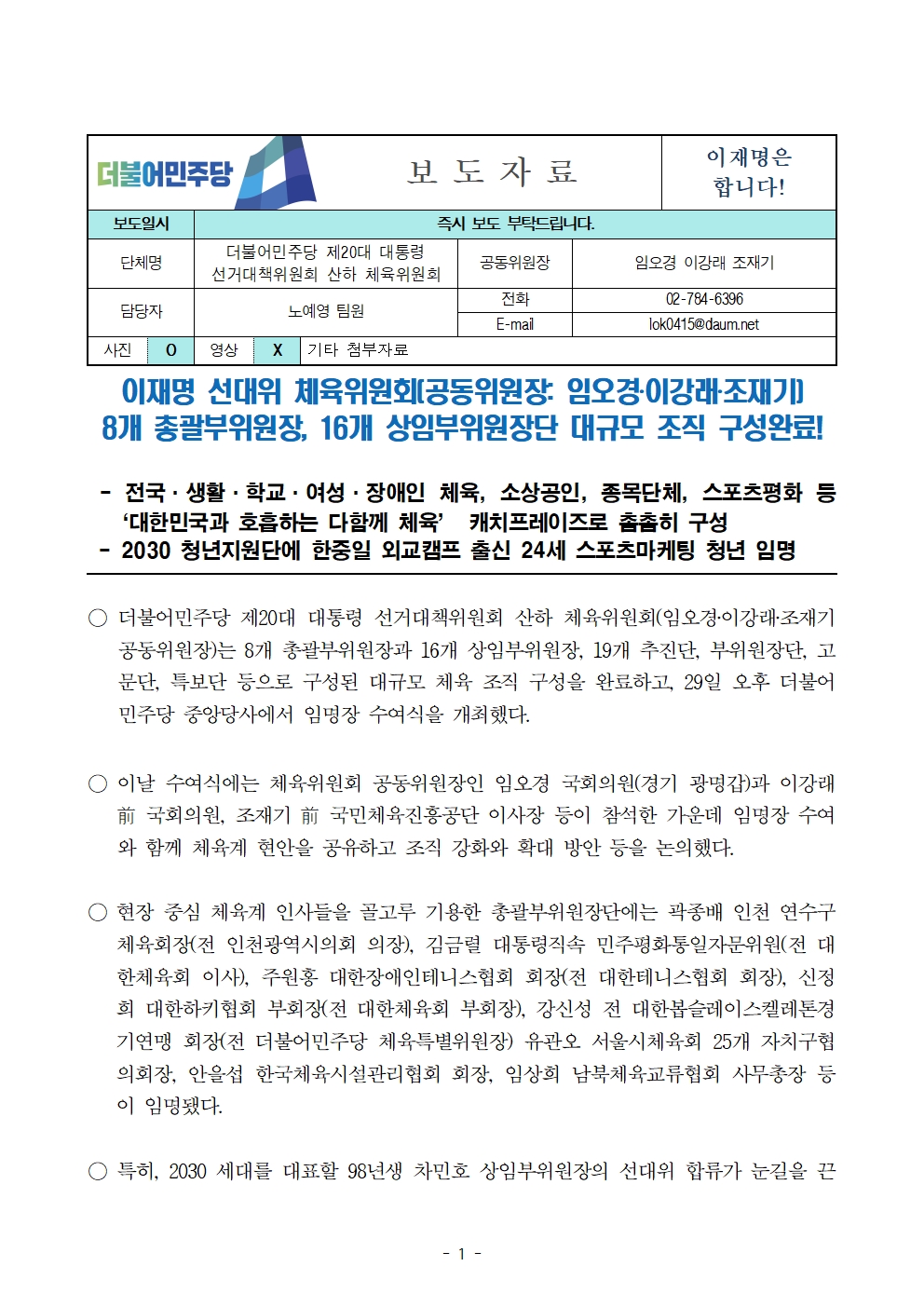 [보도자료] 더불어민주당 선대위 체육위원회 출범
