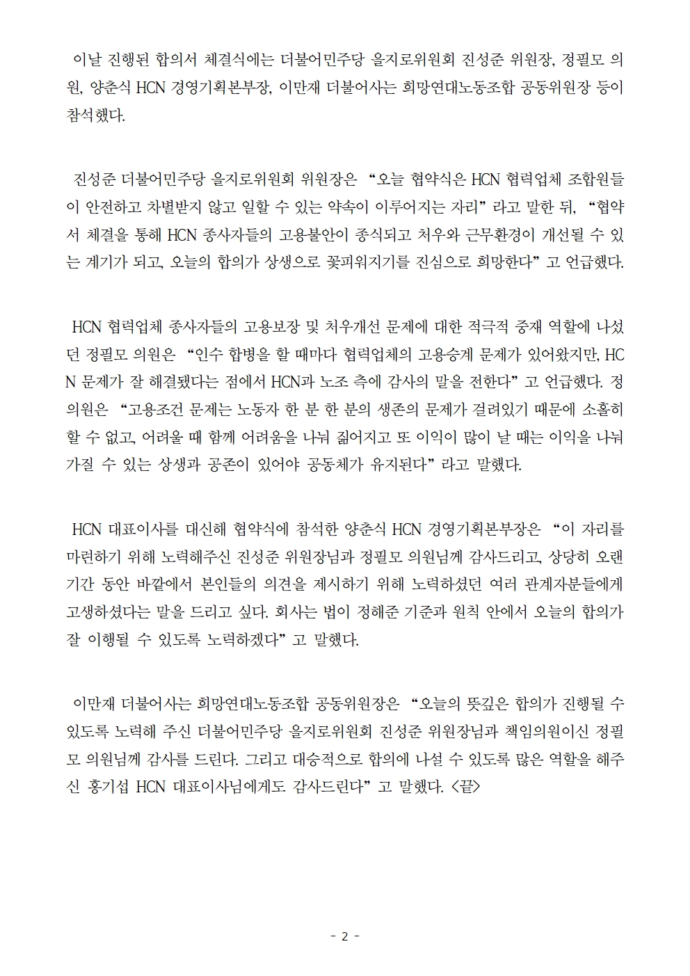 [보도자료] 더불어민주당 을지로위원회, HCN-협력업체 조합원 고용보장 및 처우개선 합의 체결