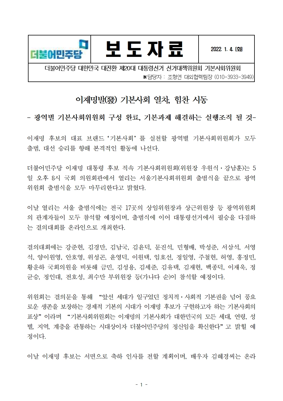 [보도자료] 더불어민주당 선대위 기본사회위원회, 서울기본사회위원회 출범식 개최