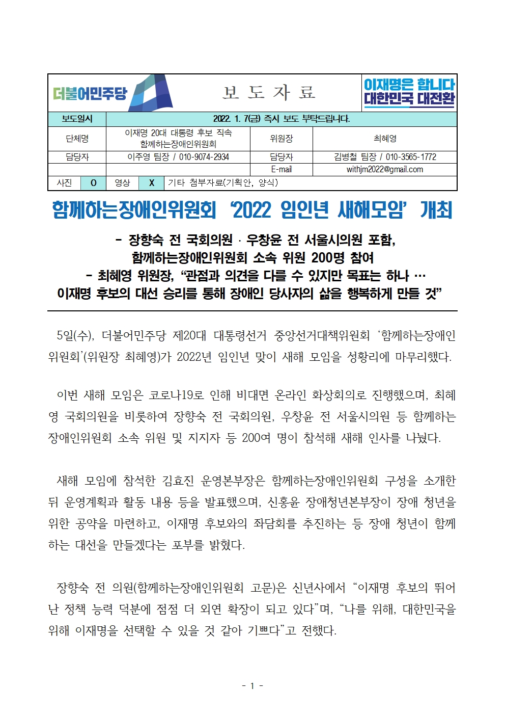 [보도자료] 더불어민주당 선대위 함께하는장애인위원회, '2022 임인년 새해모임' 개최