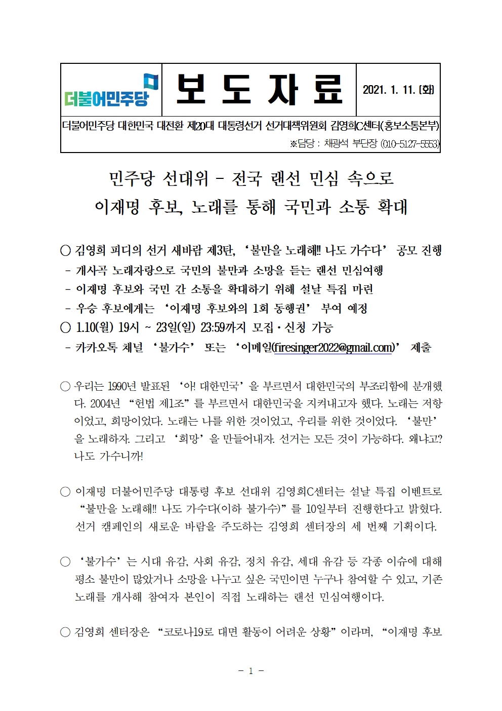 [보도자료] 더불어민주당 선대위 홍보소통본부, ‘불만을 노래해!! 나도 가수다’ 공모 진행
