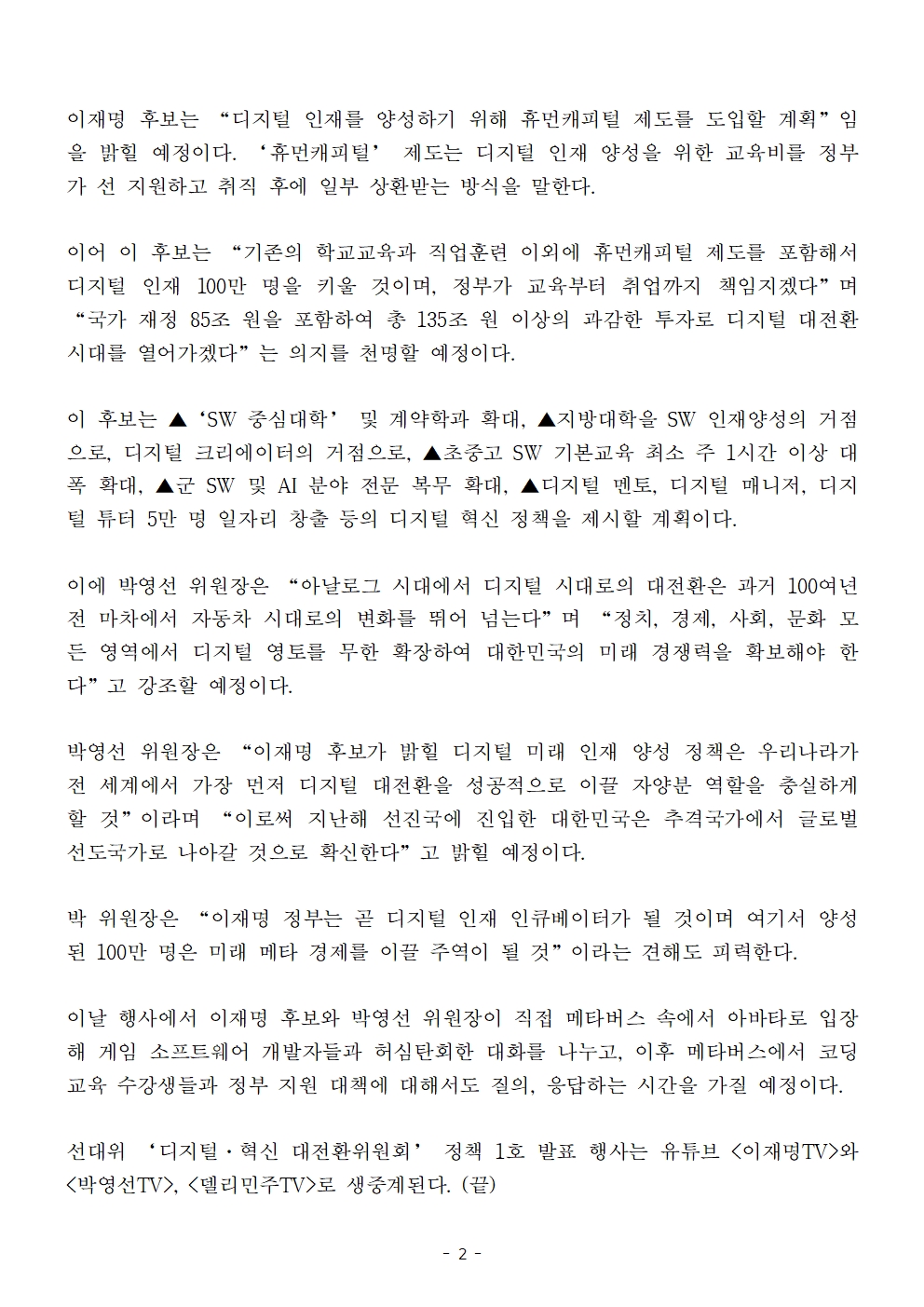 [보도자료] 더불어민주당 선대위 디지털·혁신 대전환위원회, 디지털 혁신 1호 정책공약 발표