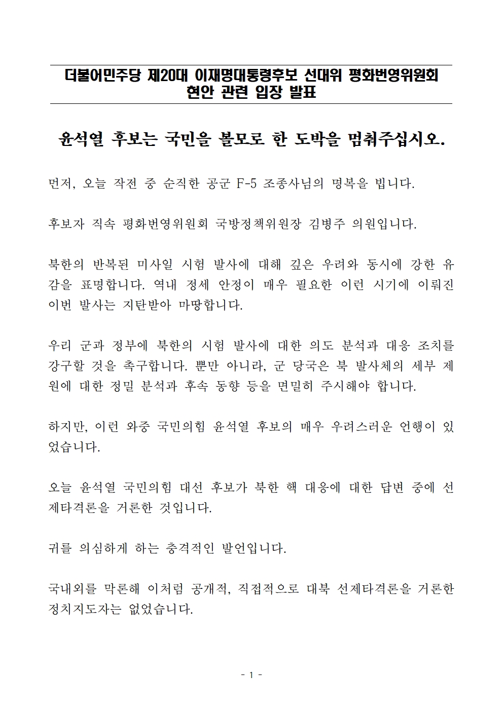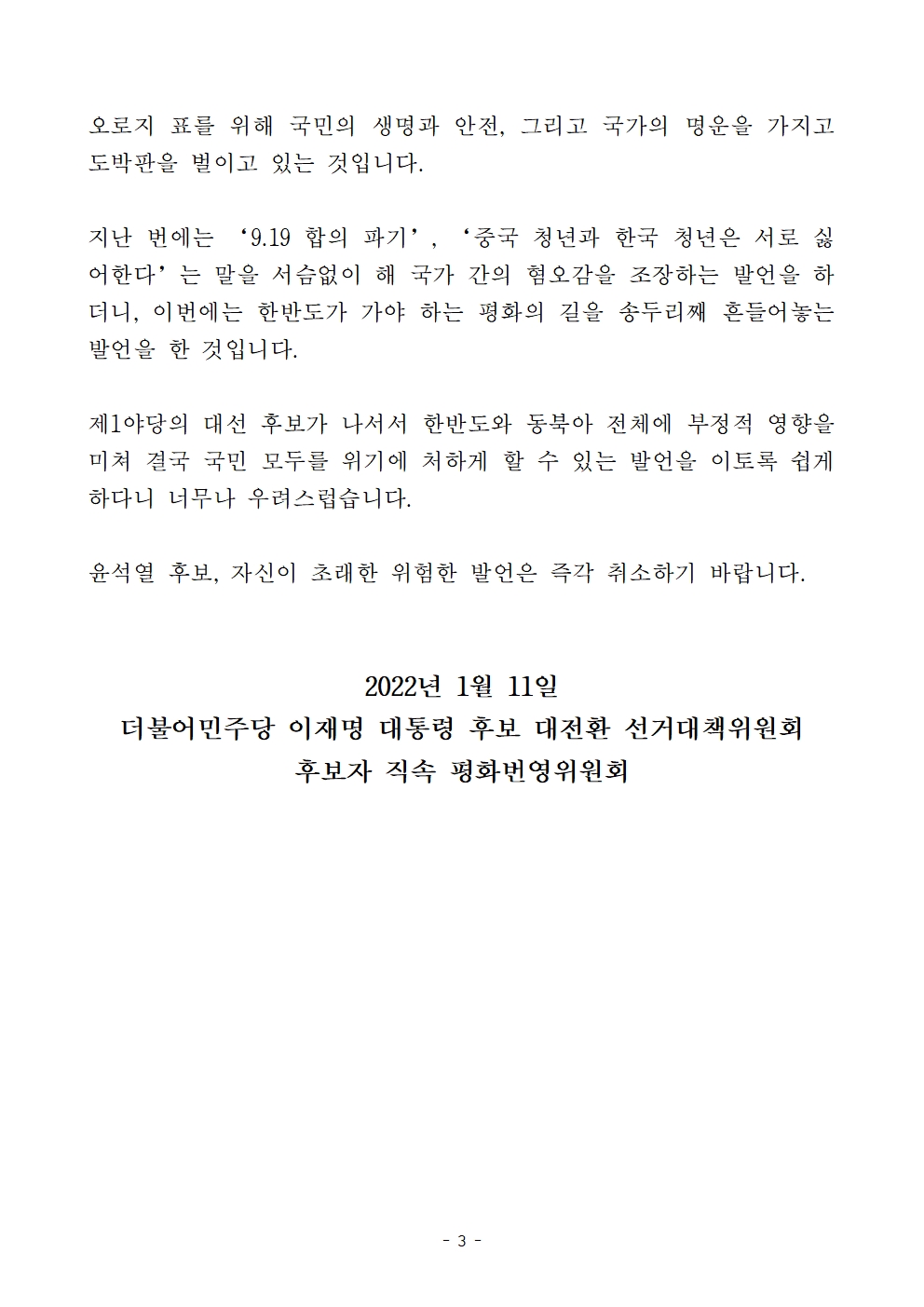 [성명서] 더불어민주당 선대위 평화번영위원회, 현안 관련 입장 발표