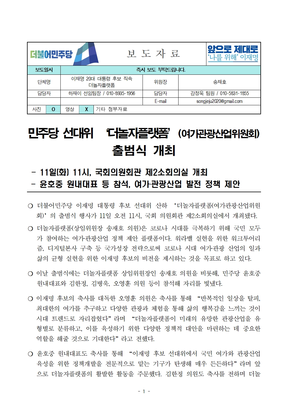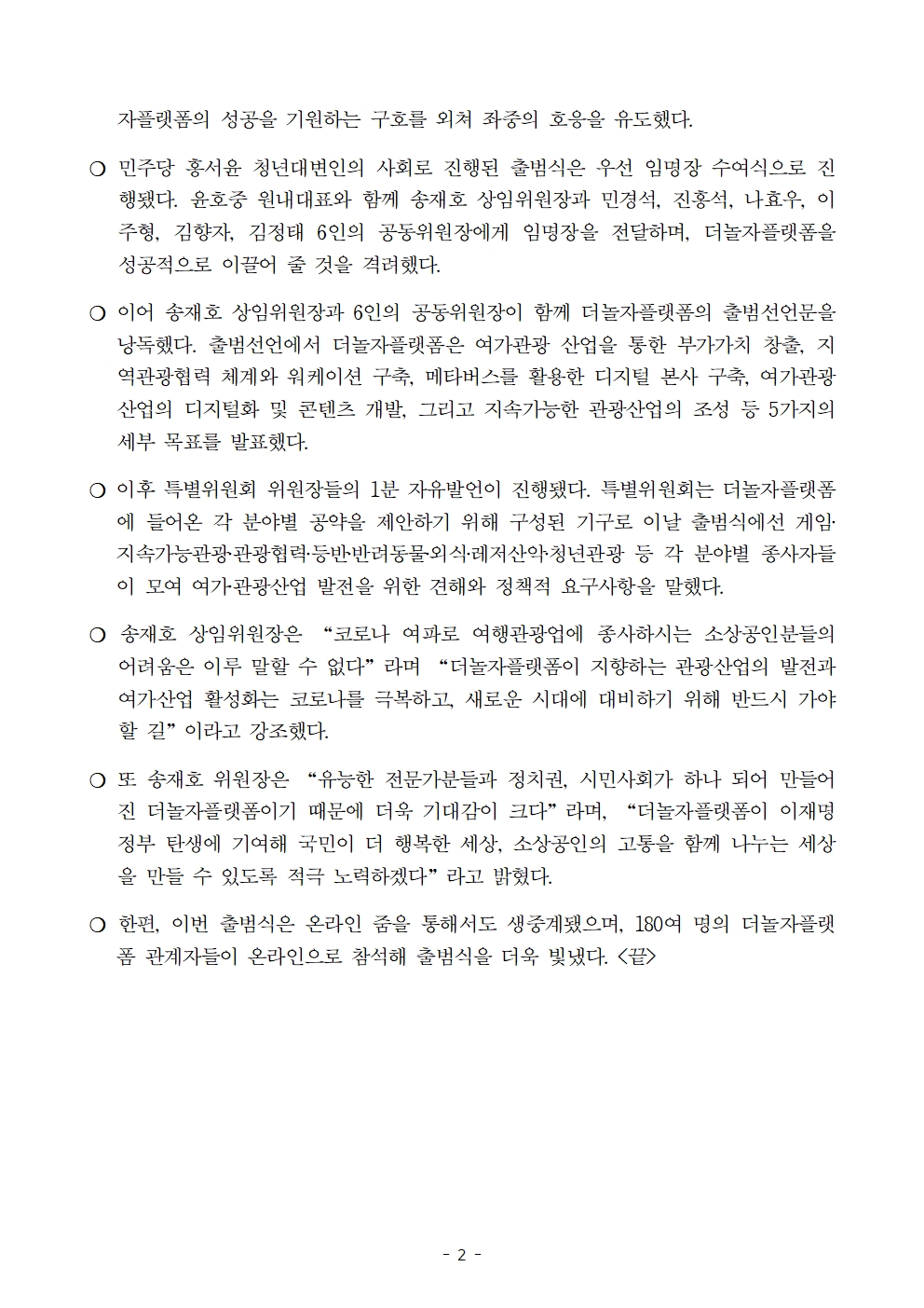 [보도자료] 더불어민주당 선대위 여가관광산업위원회(더놀자플랫폼) 출범식 개최
