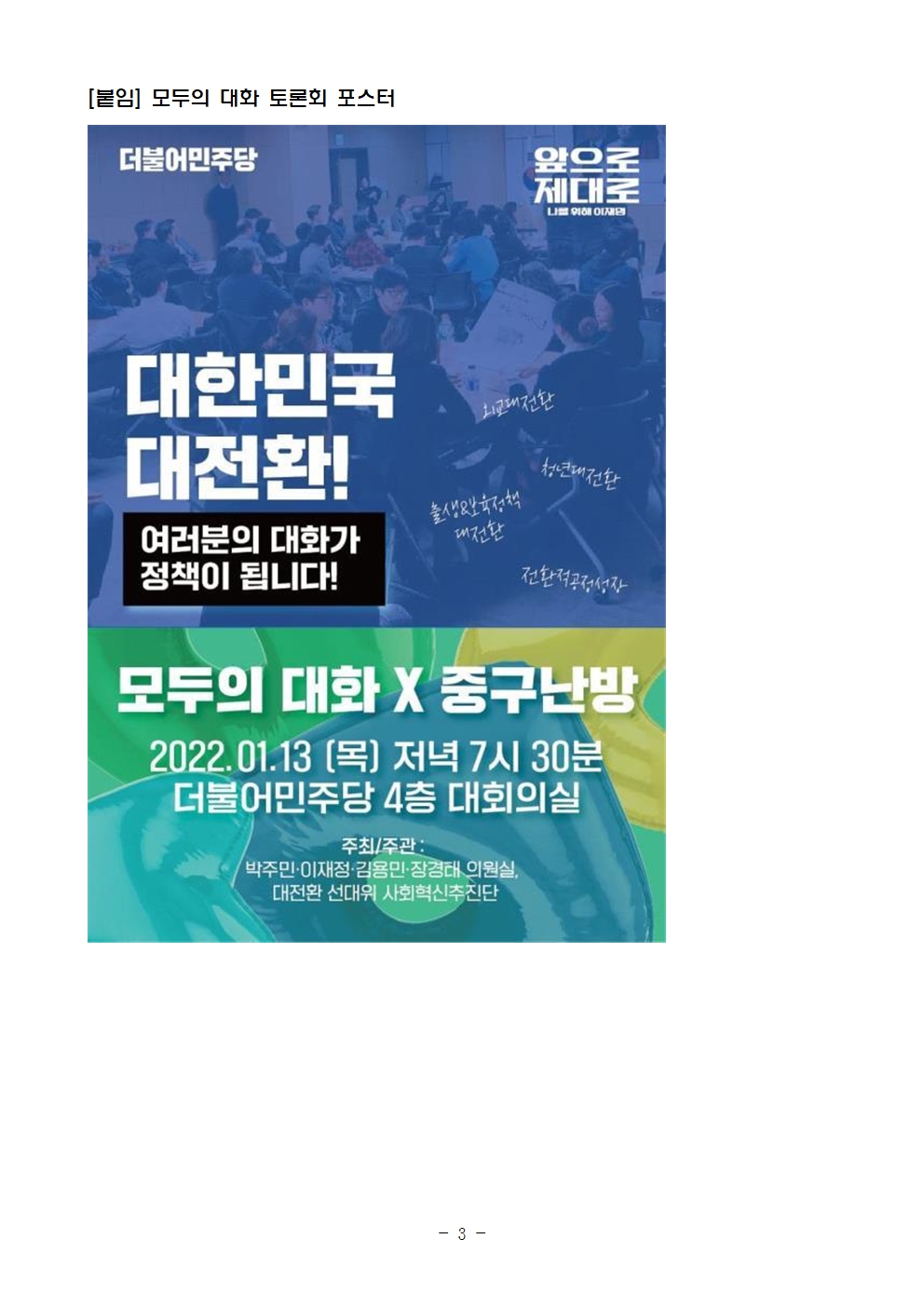 [보도자료] 더불어민주당 선대위 사회혁신추진단, 정책수다 모두의 대화 현장토론회 개최