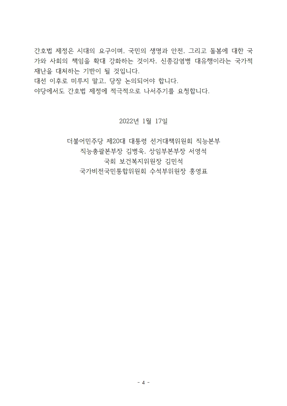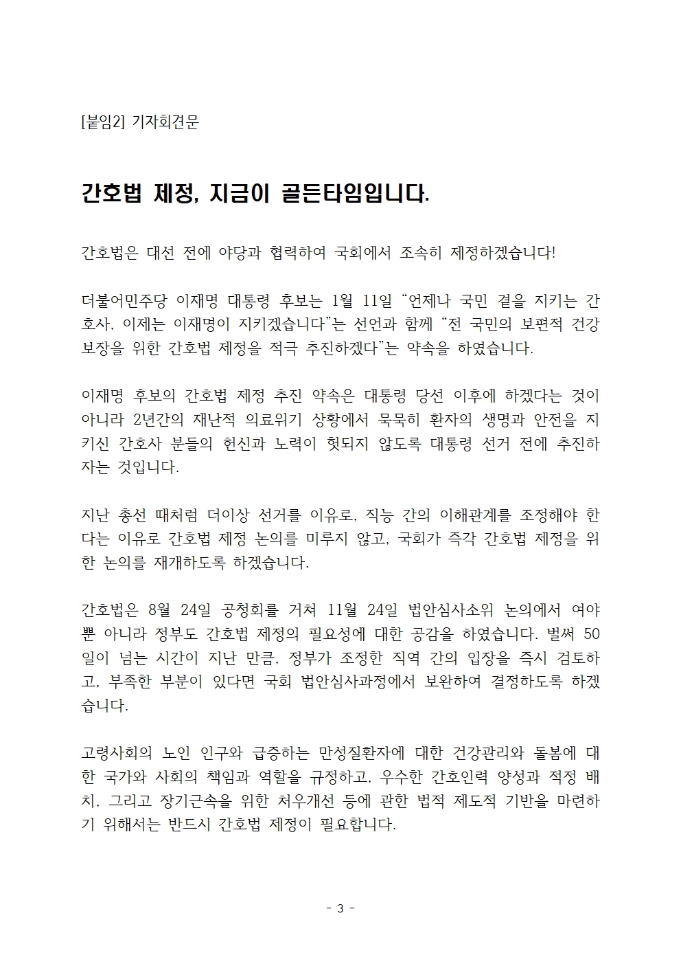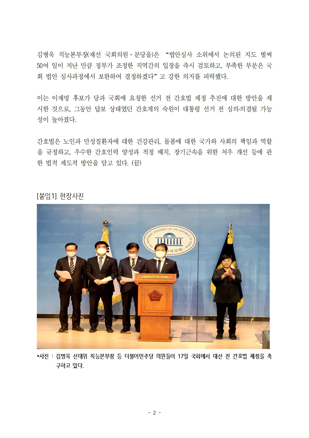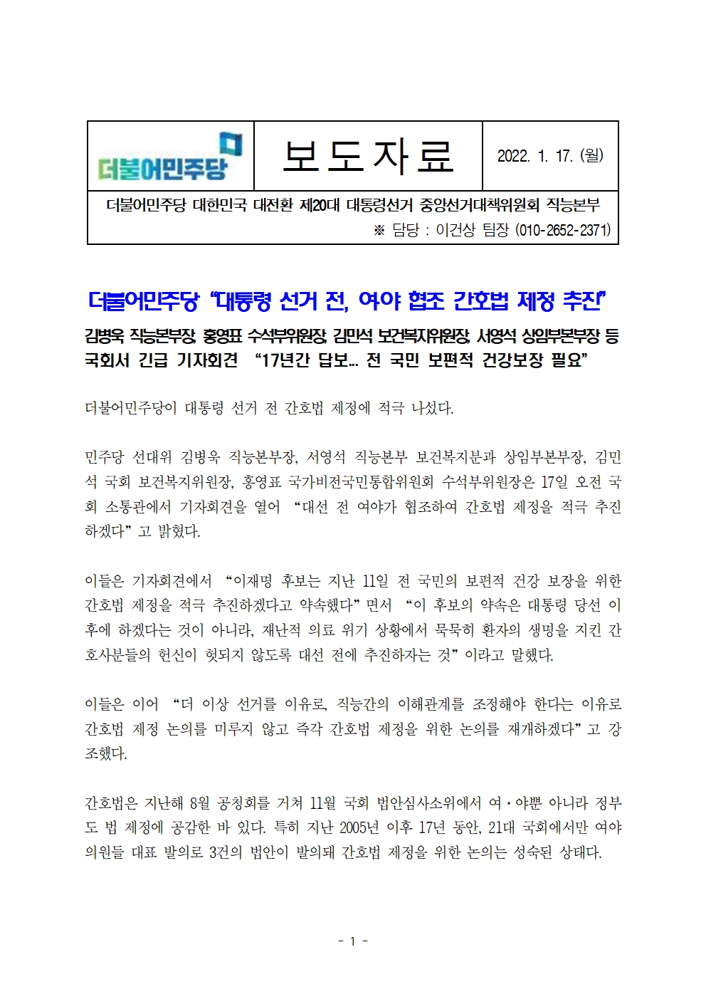 [보도자료] 더불어민주당 선대위 직능본부, 간호법 제정 적극 추진 기자회견