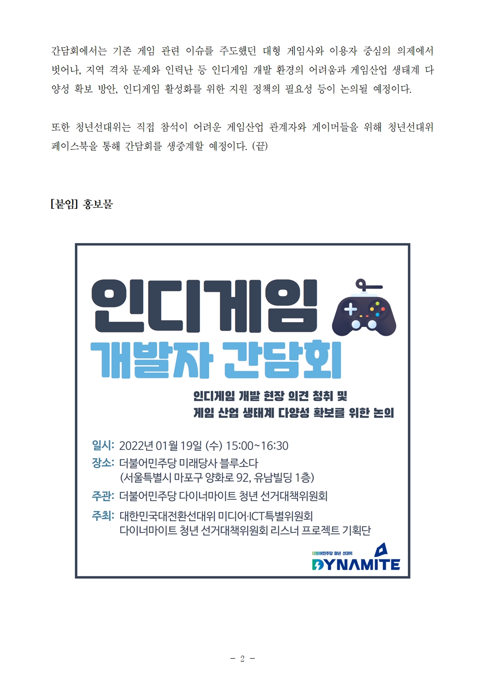 [보도자료] 더불어민주당 다이너마이트 청년선대위, '인디 게임' 개발자 간담회 개최
