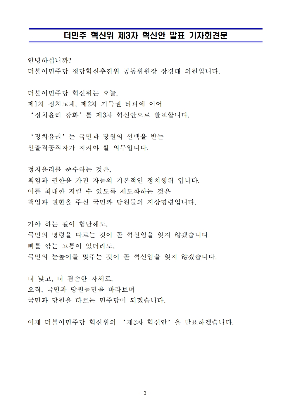 [보도자료] 더불어민주당 정당혁신추진위원회, 제3차 혁신안 발표