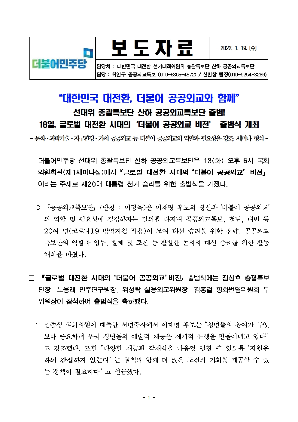 [보도자료] 더불어민주당 선대위 총괄특보단 산하 공공외교특보단 출범