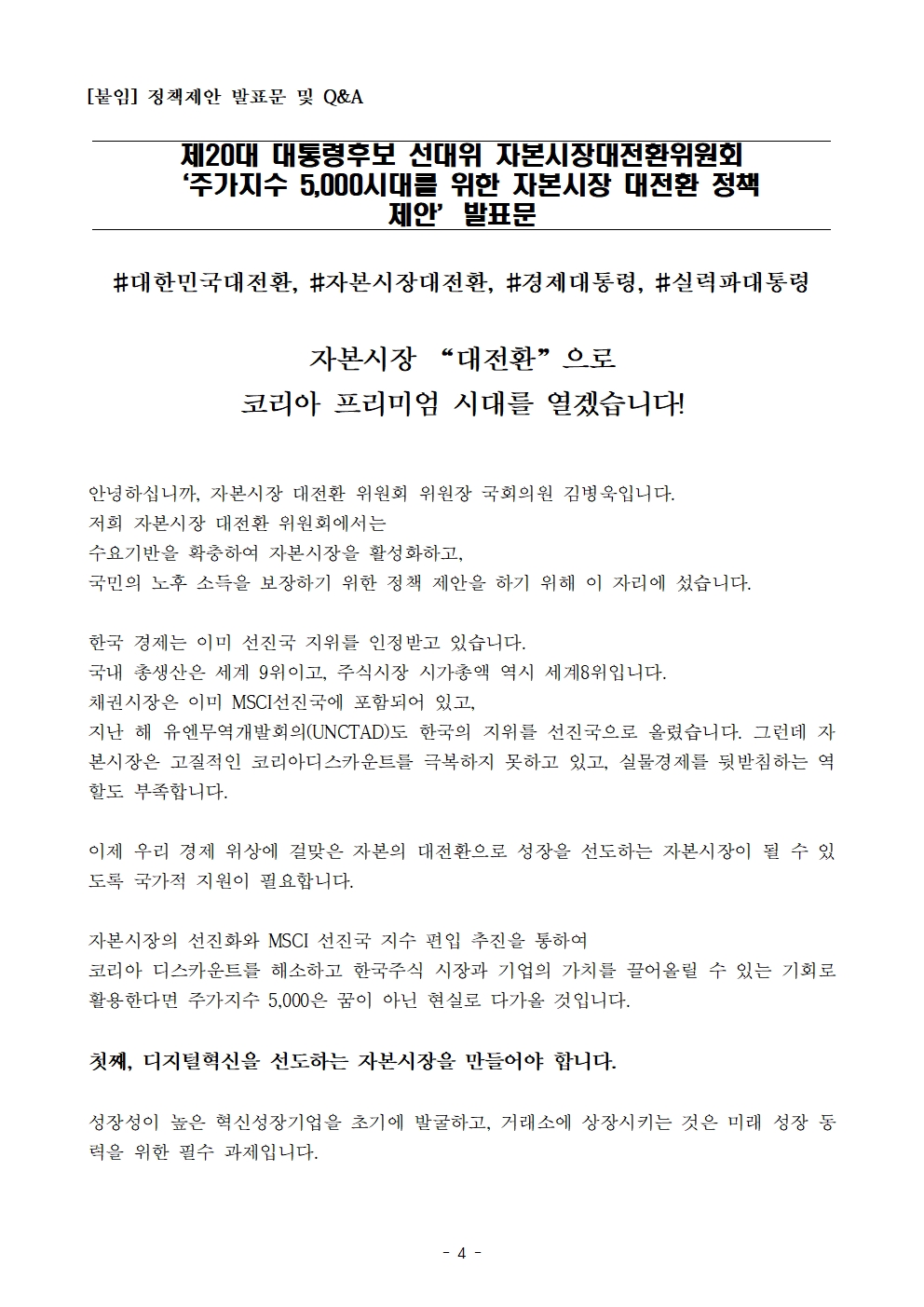 [보도자료] 더불어민주당 선대위 자본시장대전환위원회, 주가지수 5000시대를 위한 자본시장 정책 제안 발표