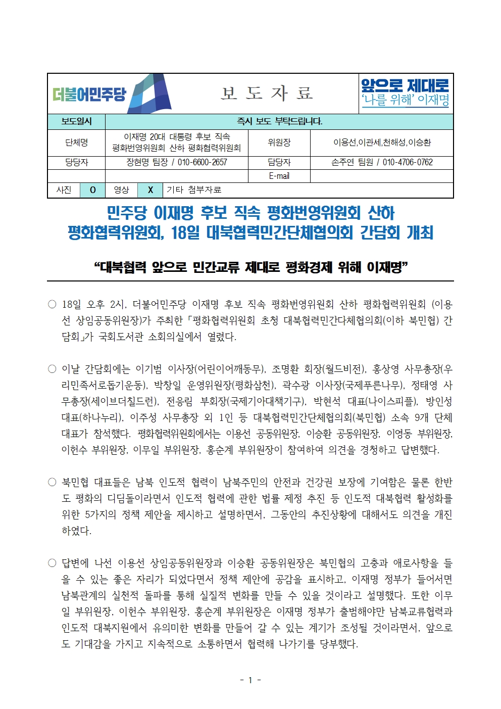 [보도자료] 더불어민주당 선대위 평화협력위원회, 대북협력민간단체협의회 간담회 개최