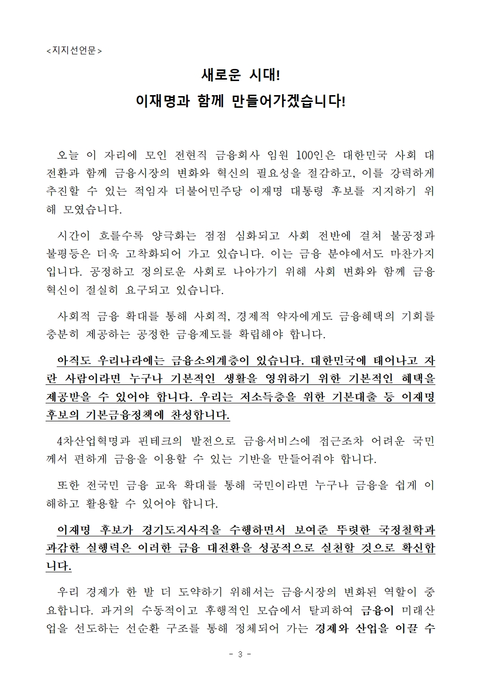 [보도자료] 더불어민주당 선대위 직능본부, 전·현직 금융권 임원 117명 이재명 후보 지지선언