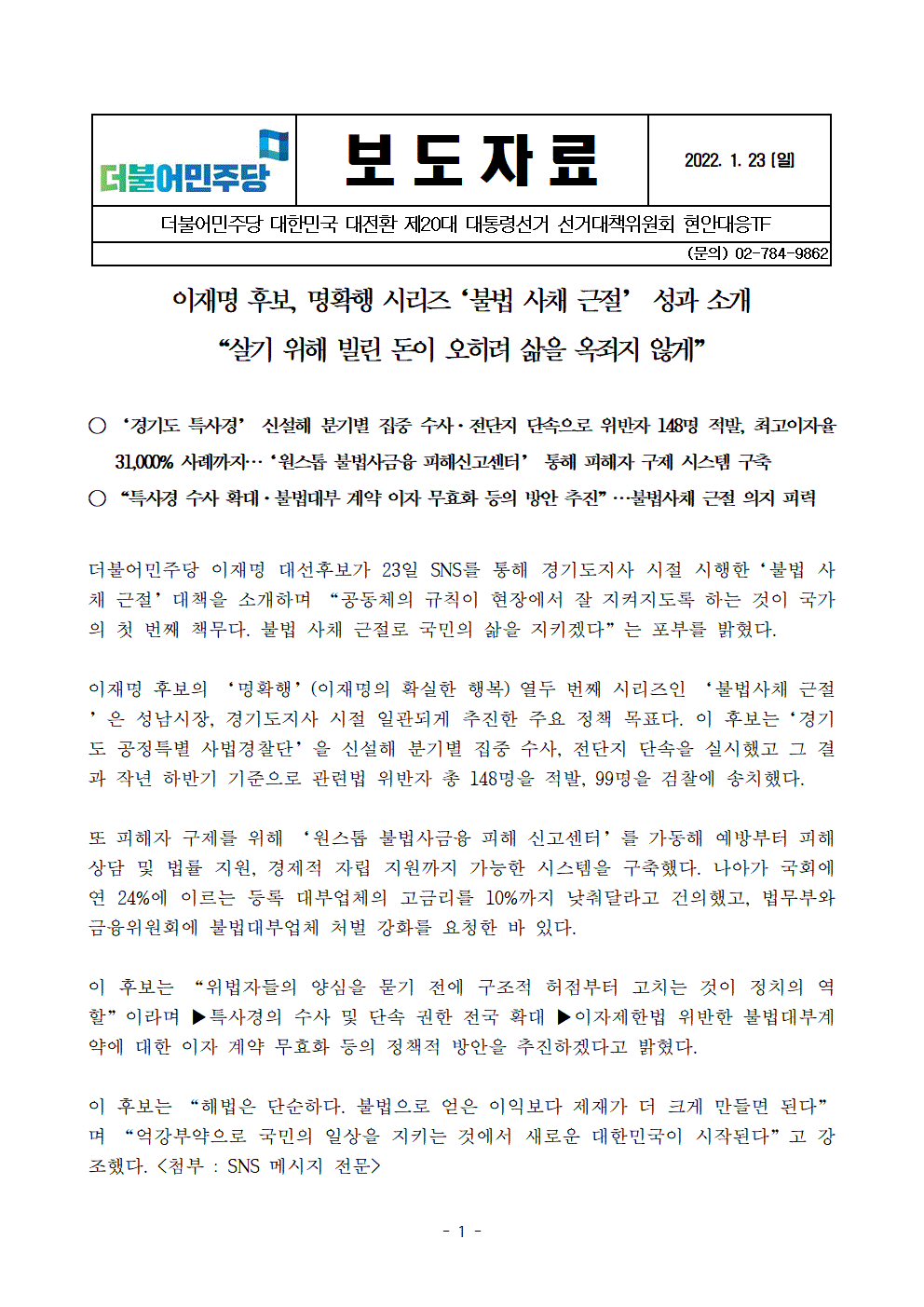 [보도자료]더불어민주당 선대위 현안대응TF, 이재명 후보, 명확행 시리즈 ‘불법 사채 근절’ 성과 소개