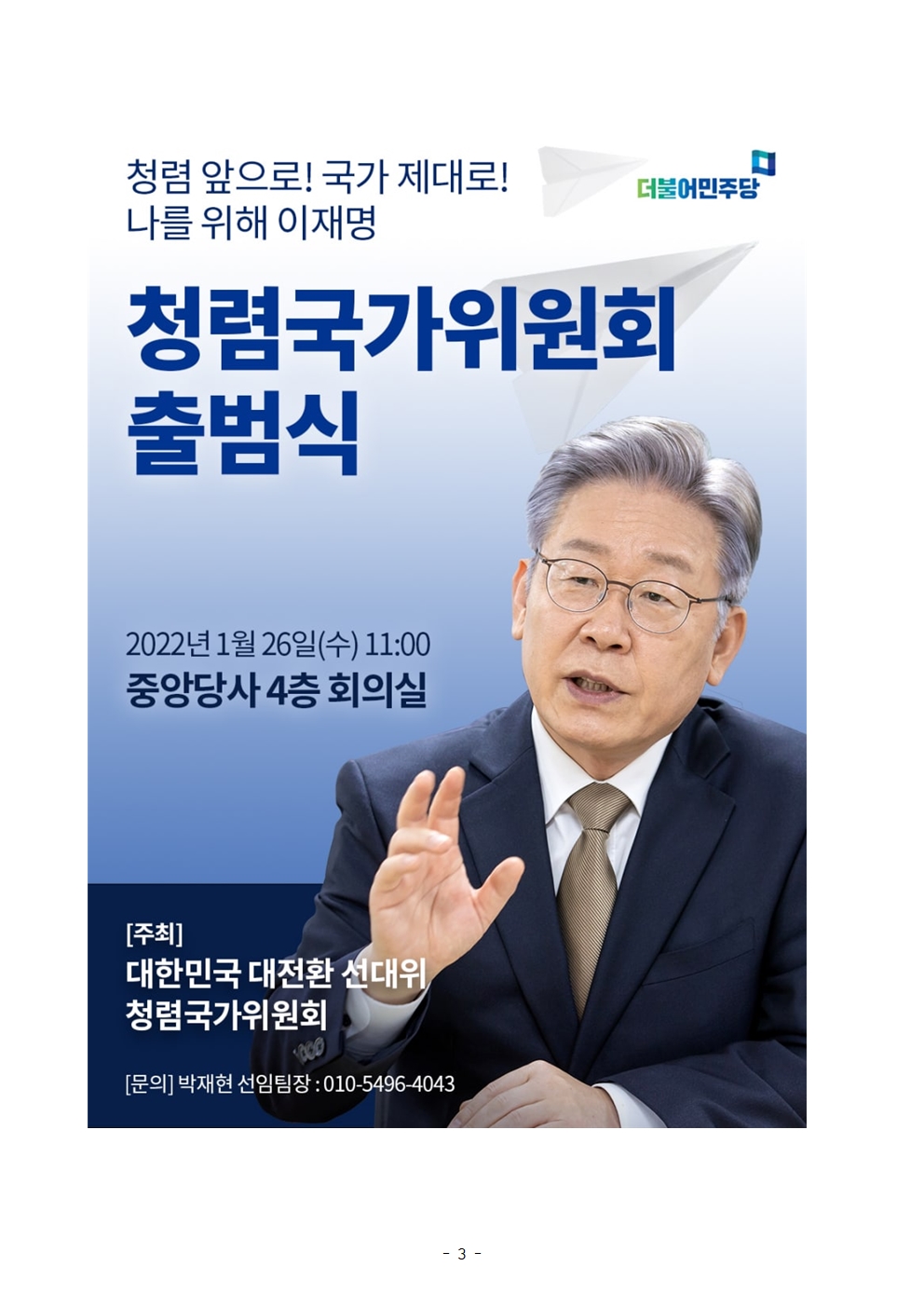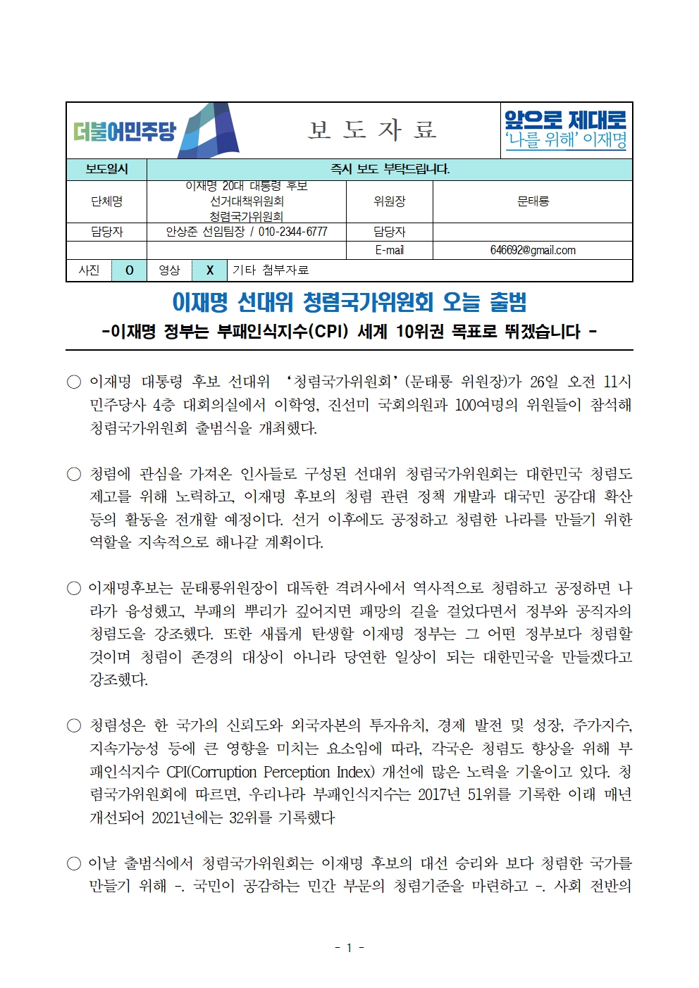 [보도자료] 더불어민주당 선대위 청렴국가위원회 출범