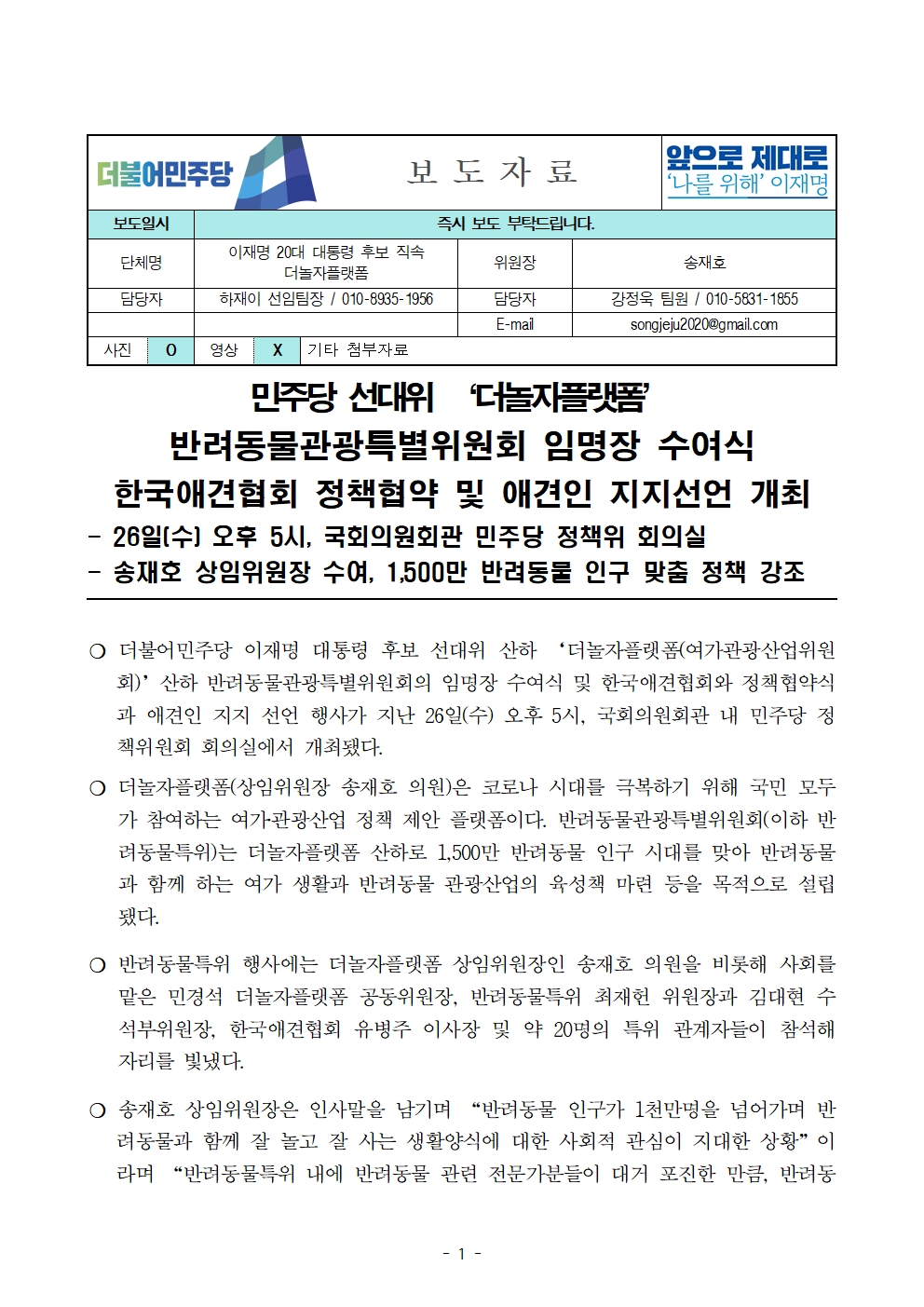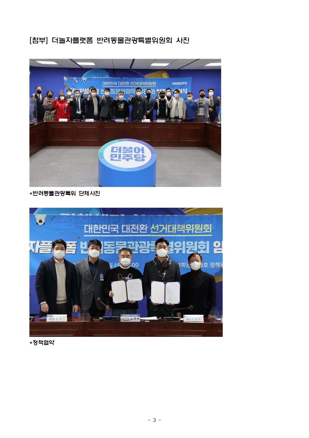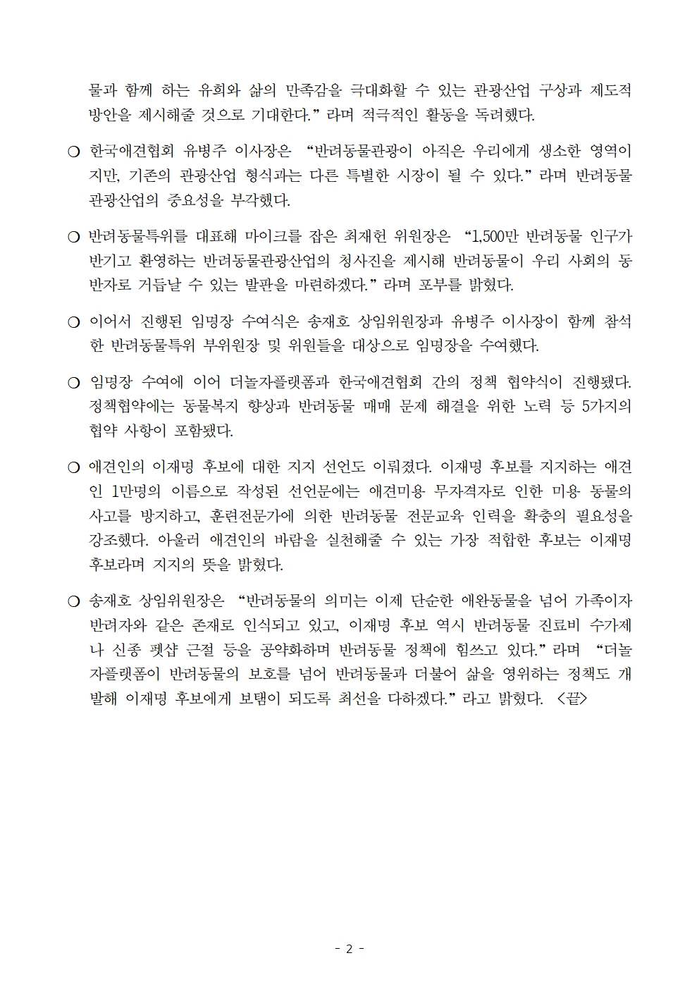 [보도자료] 더불어민주당 선대위 더놀자플랫폼, 반려동물관광특별위원회 임명장 수여식 및 한국애견협회 정책협약 · 애견인 지지선언 개최