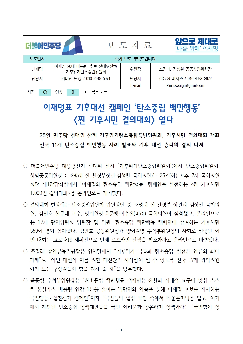 [보도자료] 더불어민주당 선대위 기후위기탄소중립특별위원회, 탄소중립 백만행동 '찐 기후시민 결의대회' 개최
