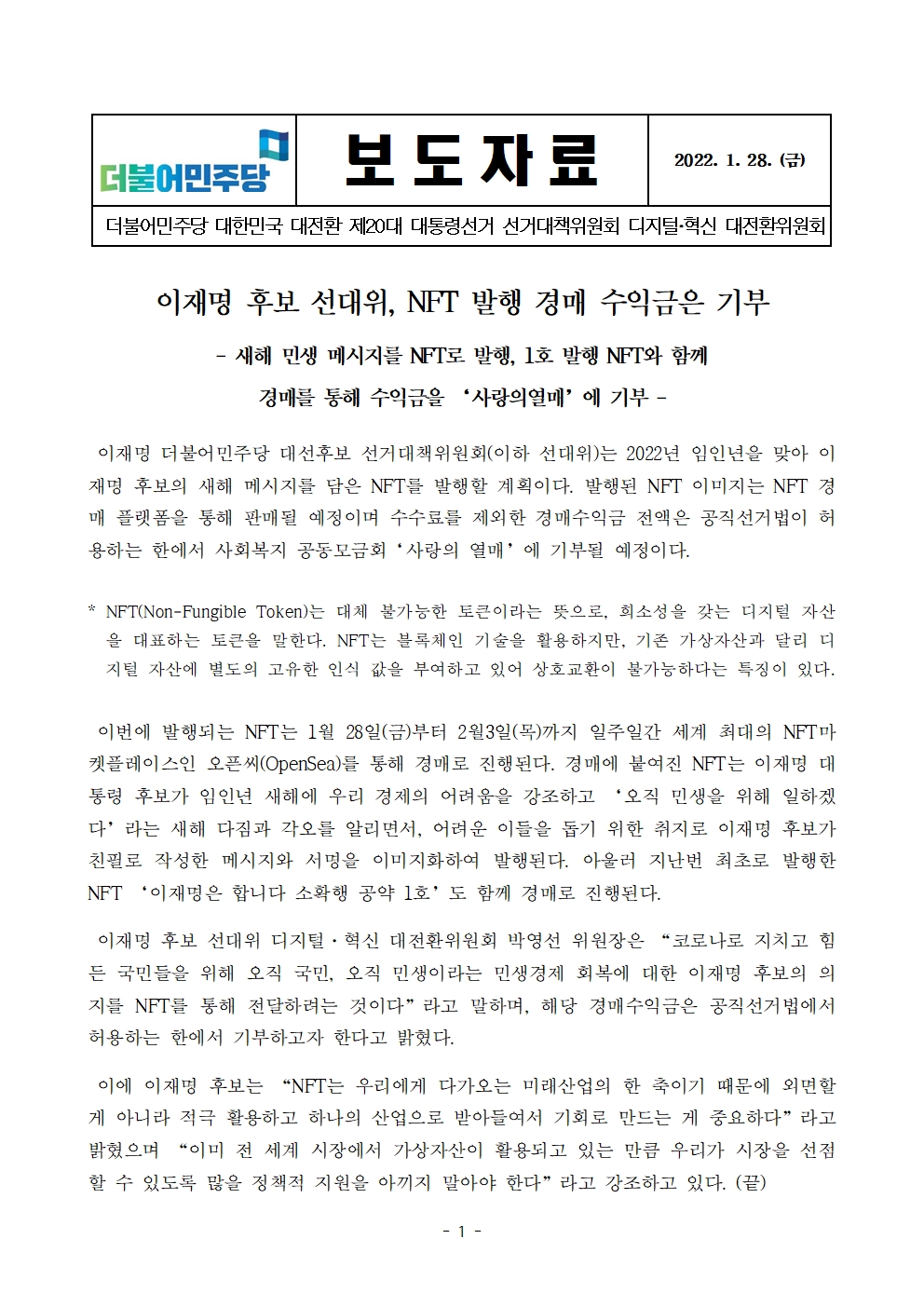 [보도자료] 더불어민주당 선대위 디지털·혁신 대전환위원회, 새해 민생 메세지 NFT 발행 및 경매 수익금 기부