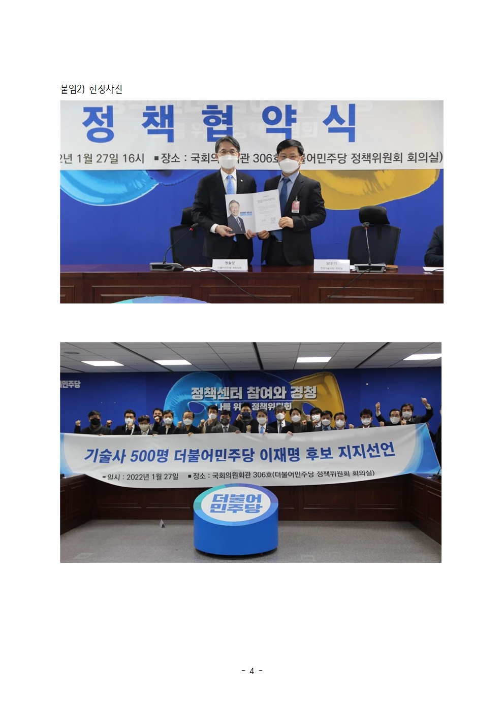[보도자료] 더불어민주당 선대위 직능본부, 기술사 500인 지지선언 · 한국기술사회 정책협약 체결