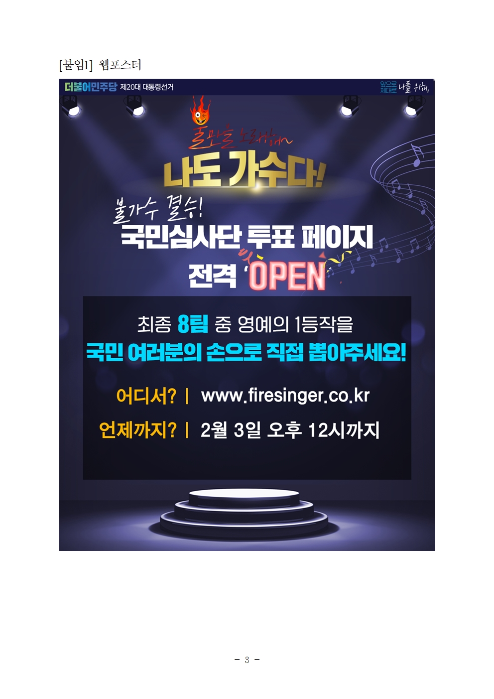 [보도자료] 더불어민주당 선대위 김영희C센터(홍보소통본부), ‘불만을 노래해!! 나도 가수다’ 결승 온라인 투표 시작