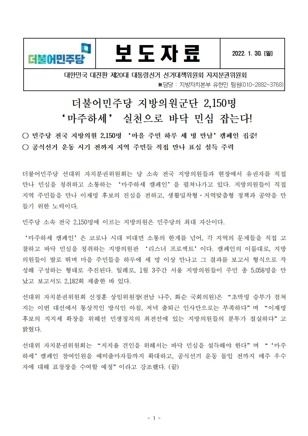 [보도자료] 더불어민주당 선대위 자치분권위원회, 지방의원 '마주하세 캠페인' 실천
