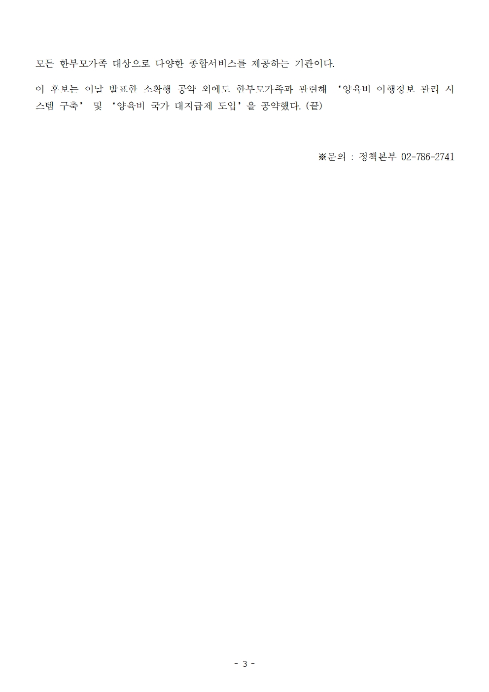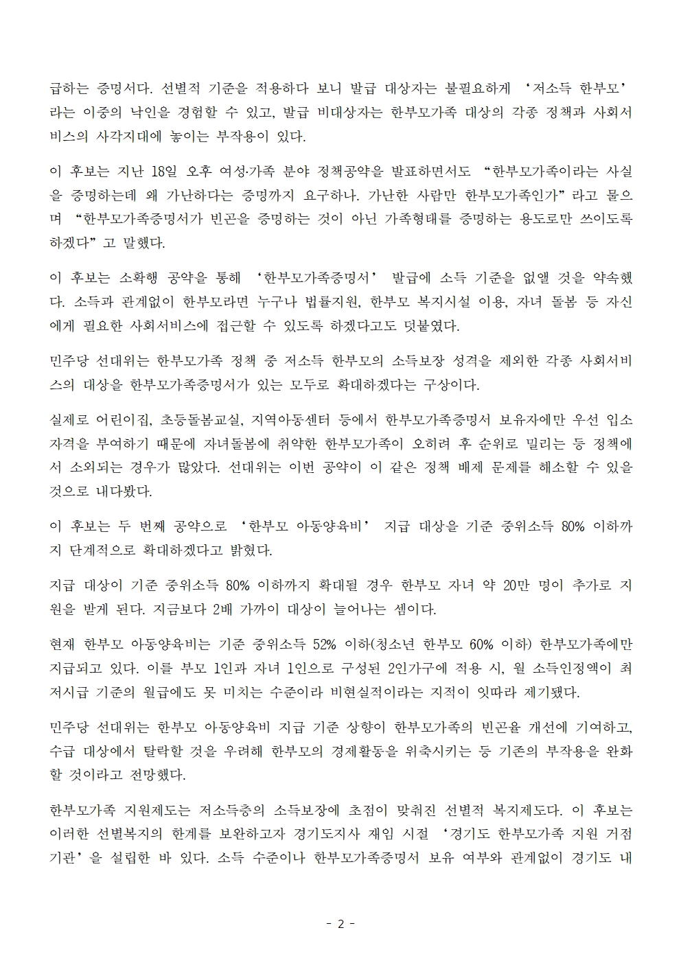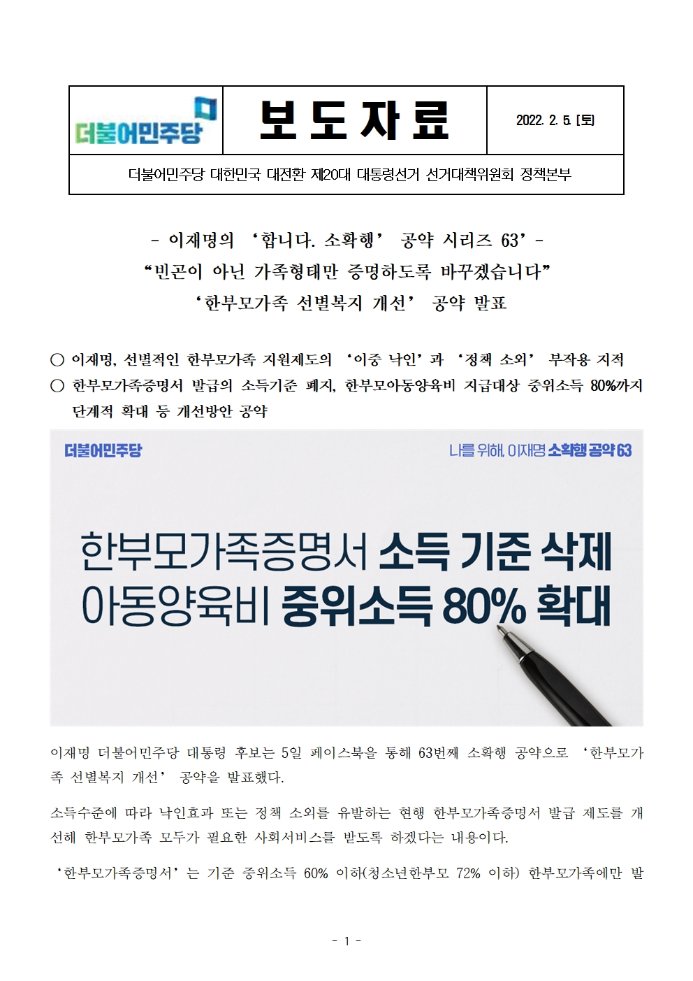 [보도자료] 더불어민주당 선대위 정책본부, '이재명은 합니다. 소확행 공약 시리즈 63' 한부모가족 선별복지 개선 공약 발표