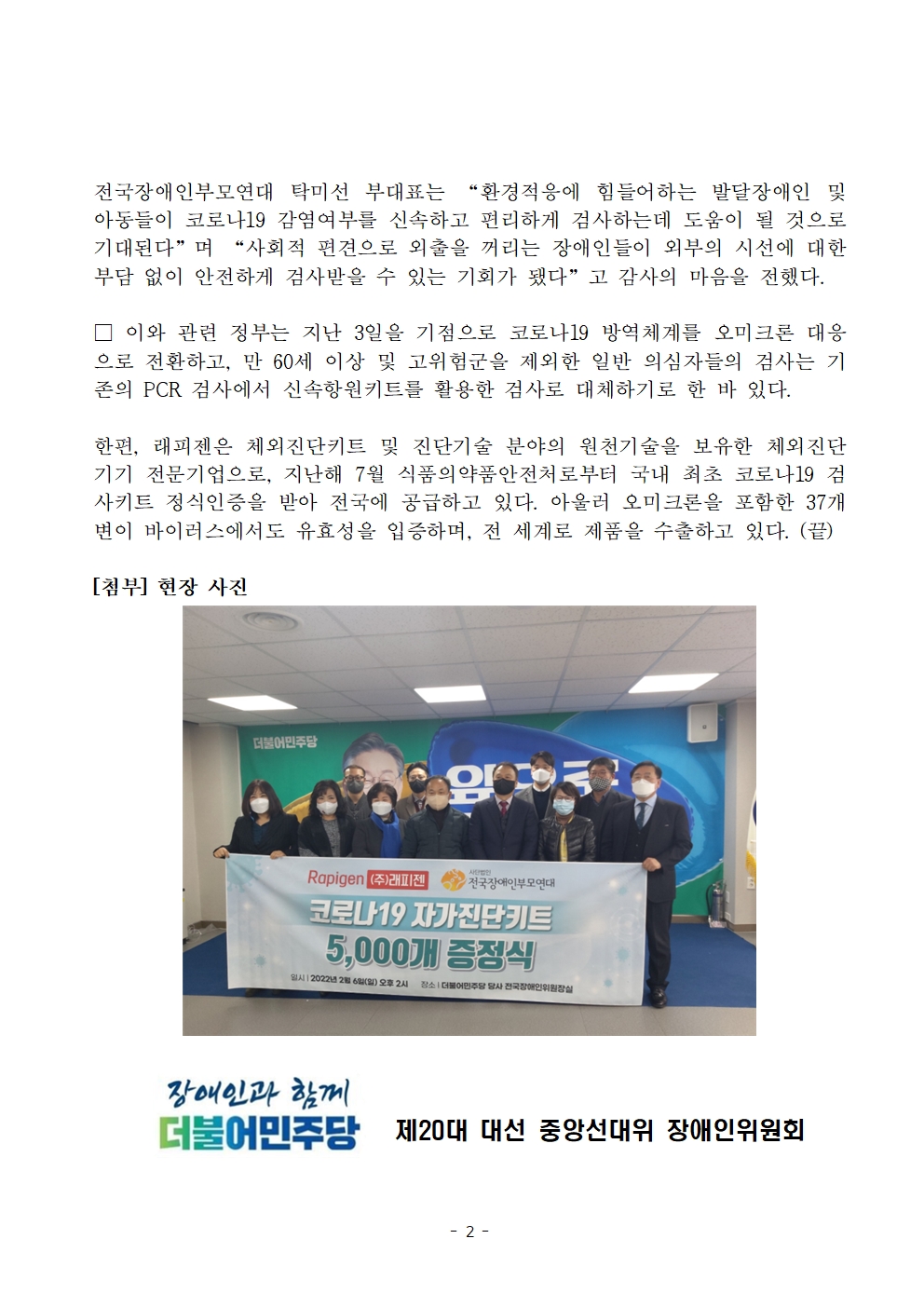 [보도자료] 더불어민주당 선대위 전국장애인위원회, 래피젠, 전국장애인부모연대에 신속항원검사키트 기증 지원