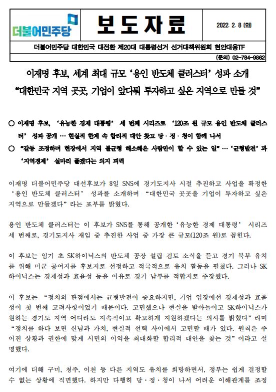 [보도자료] 더불어민주당 선대위 현안대응TF, 이재명 후보 '유능한 경제대통령' 세 번째 시리즈, '120조 원 규모 용인 반도체 클러스터' 성과 공개