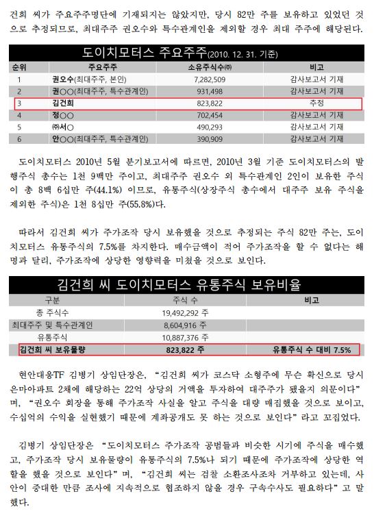 (수정) [보도자료] 더불어민주당 선대위 현안대응TF, 김건희 씨, 도이치모터스 주가조작 당시 특수관계인 제외 최대주주, 주식 유통물량 7.5% 보유 상당한 영향력 미쳤을 것