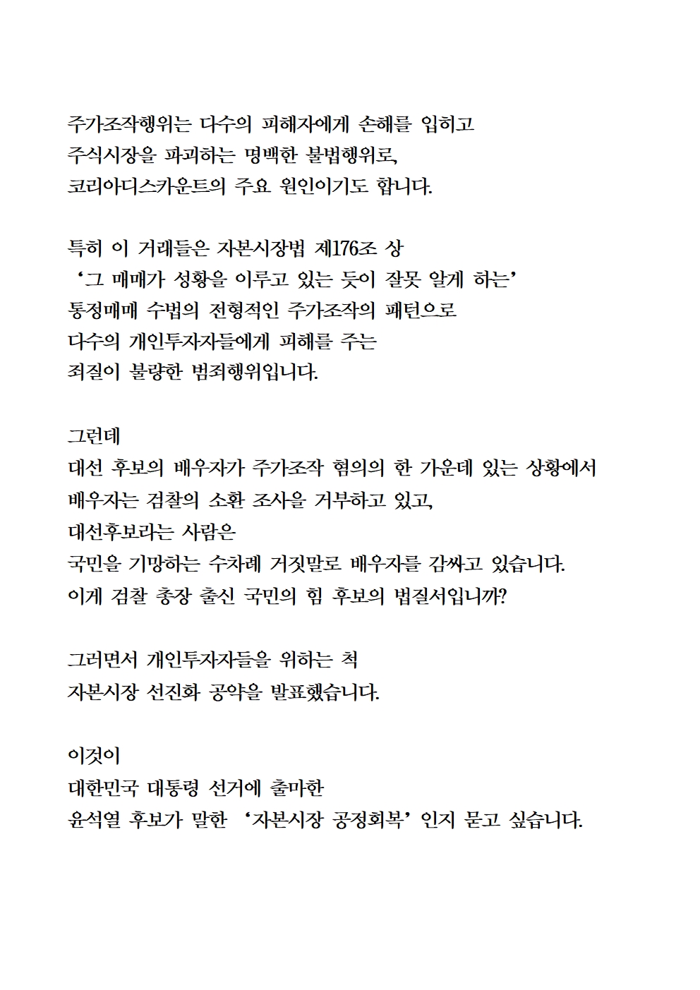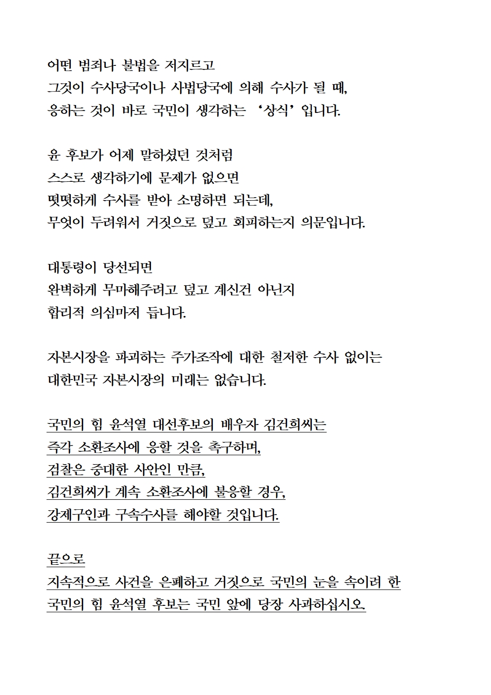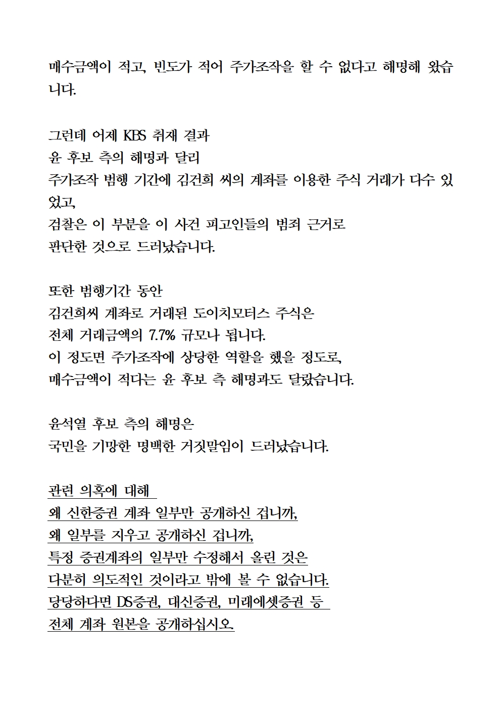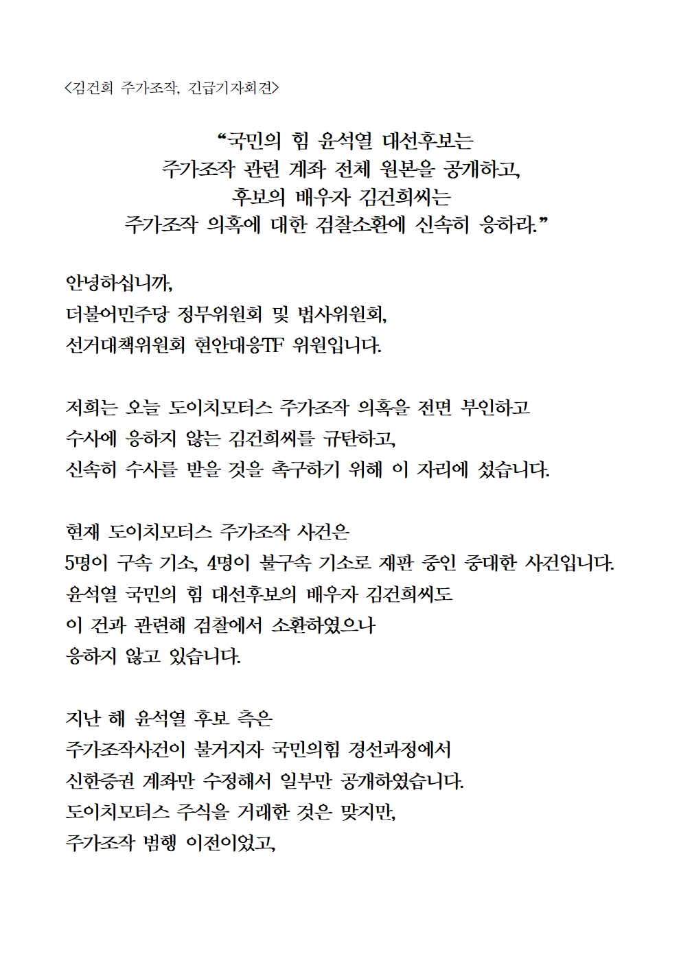 [기자회견문] 더불어민주당 국회 정무위원회 및 법사위원회 위원, 선대위 현안대응TF 공동기자회견 "윤석열 후보는 주가조작 관련 계좌 전체 원본 공개, 김건희씨는 검찰소환 응하라"