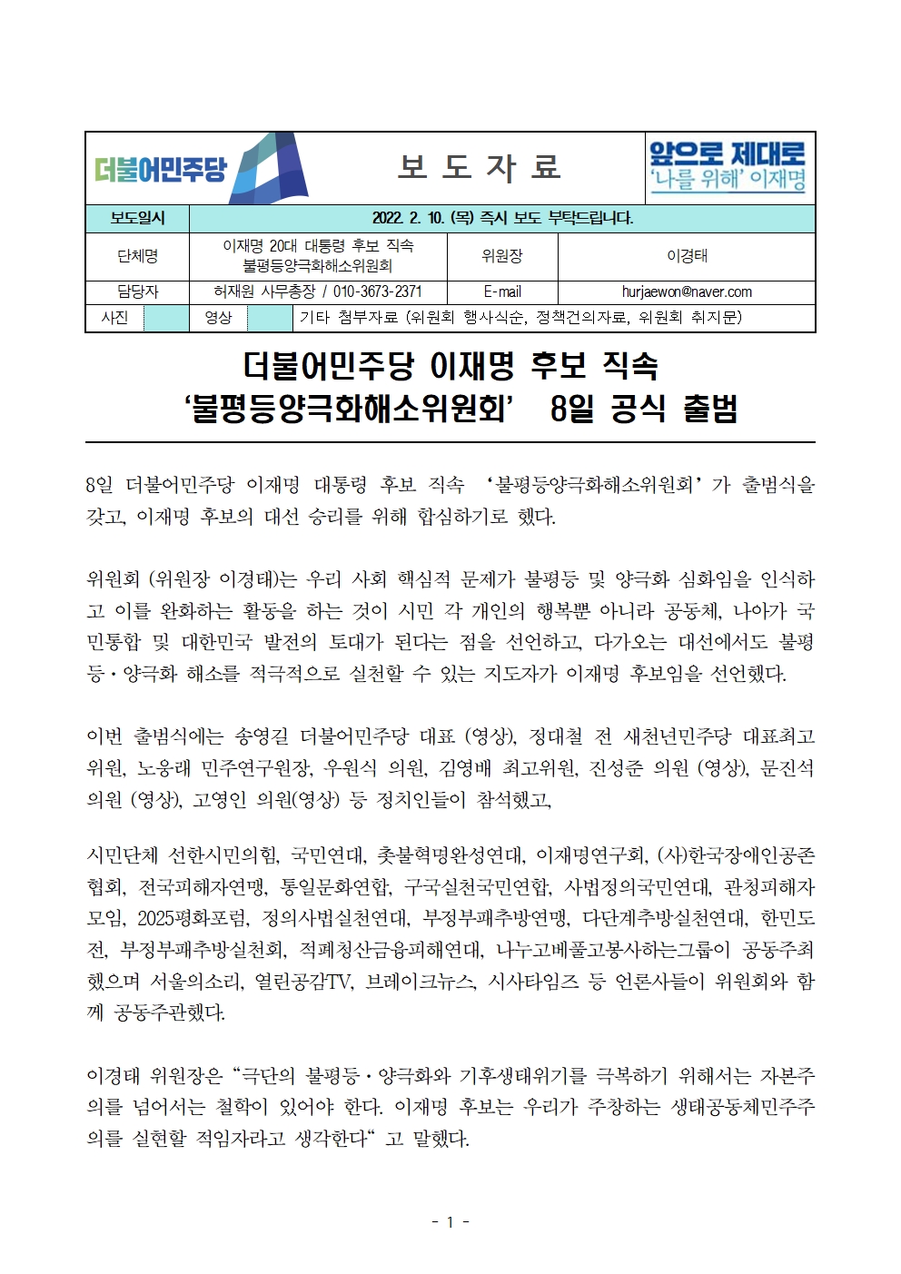 [보도자료] 더불어민주당 선대위 불평등양극화해소위원회 공식 출범