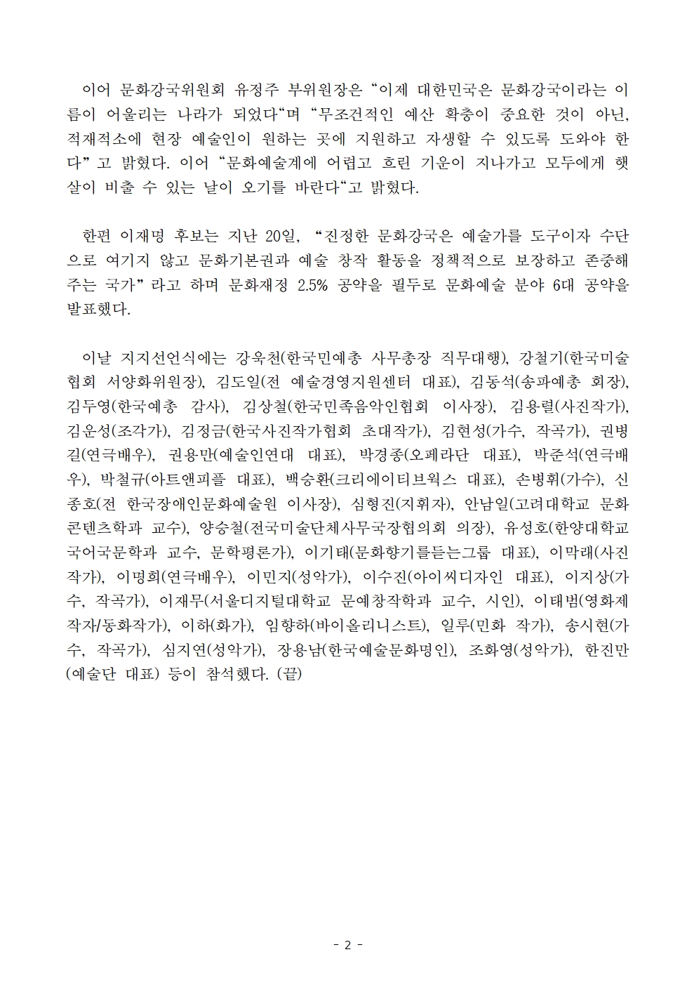 [보도자료] 더불어민주당 선대위 문화강국위원회, 서울 문화예술인 1만 1백명 후보 지지 선언