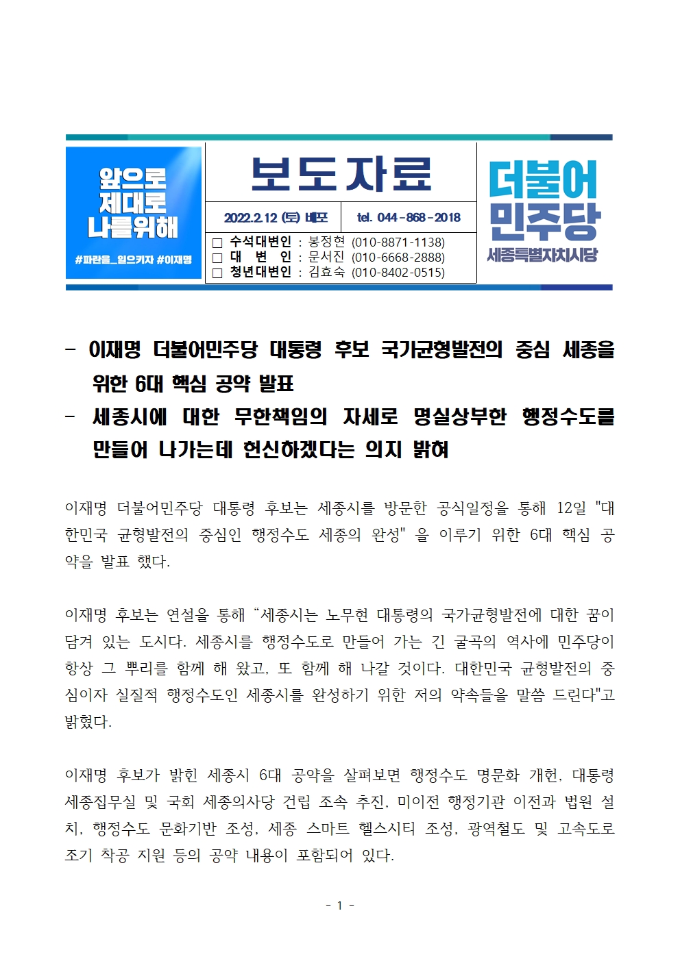 [보도자료] 더불어민주당 선대위 정책본부, 세종 6대 공약 발표