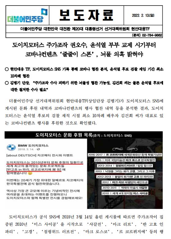 [보도자료] 더불어민주당 선대위 현안대응TF, 주가조작으로 구속기소된 도이치모터스 권오수 회장, 윤석열 부부 교제 시기부터 코바나컨텐츠 '줄줄이 스폰', 뇌물 의혹 밝혀야