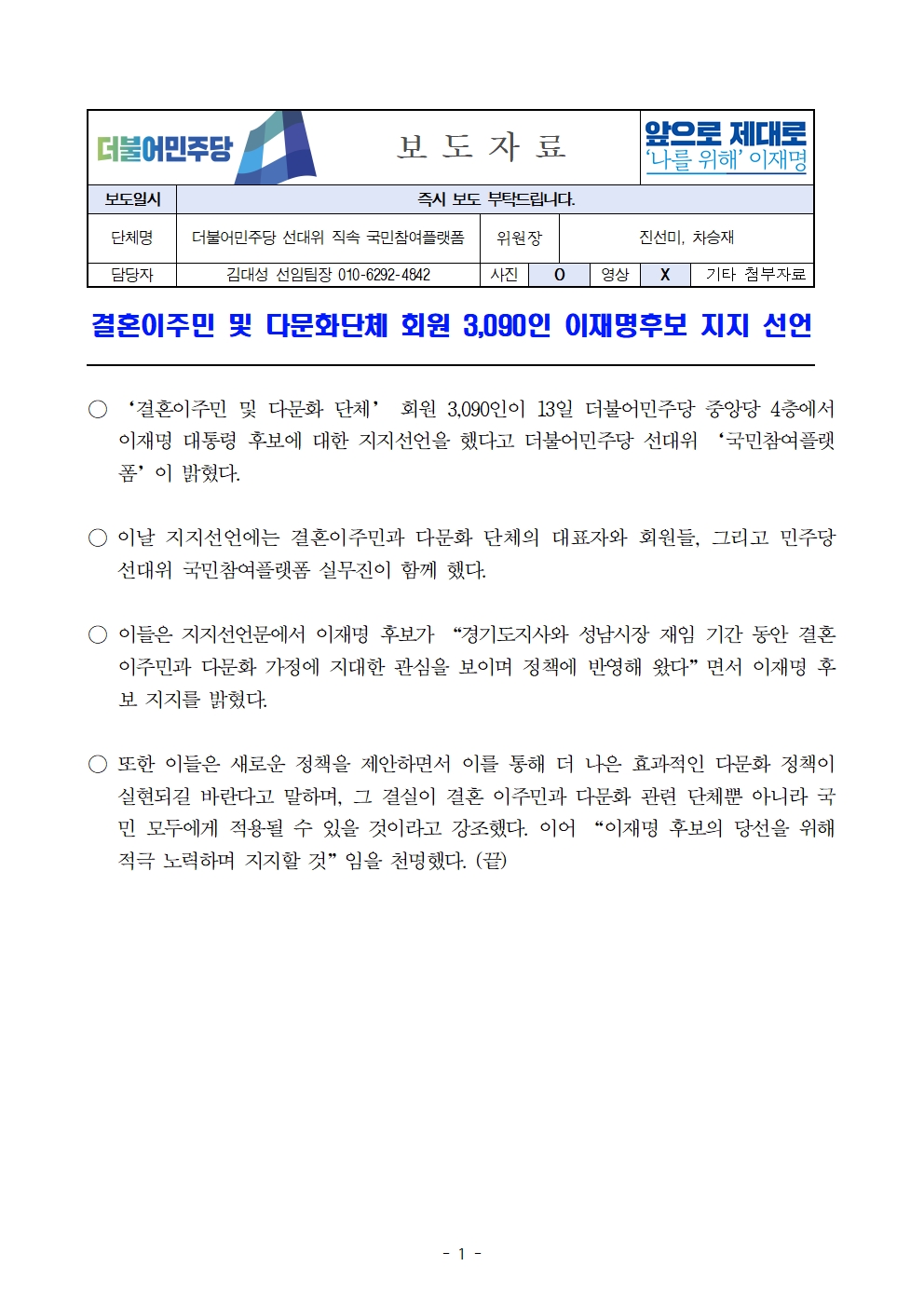 [보도자료] 더불어민주당 선대위 국민참여플랫폼, 결혼이주민 및 다문화단체 회원 3,090인 후보 지지선언