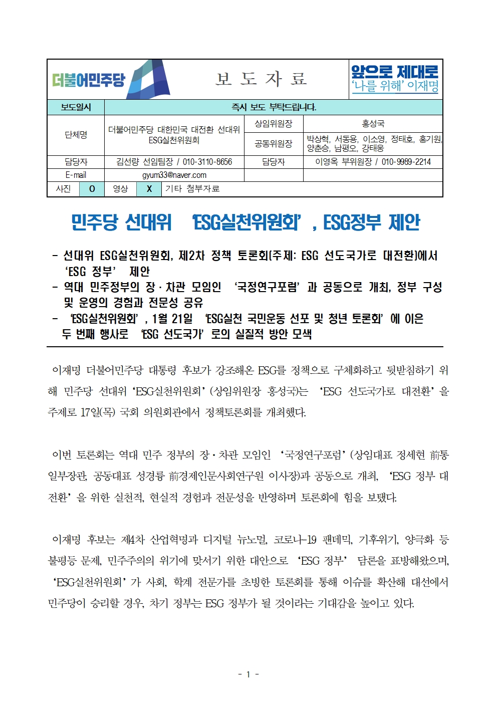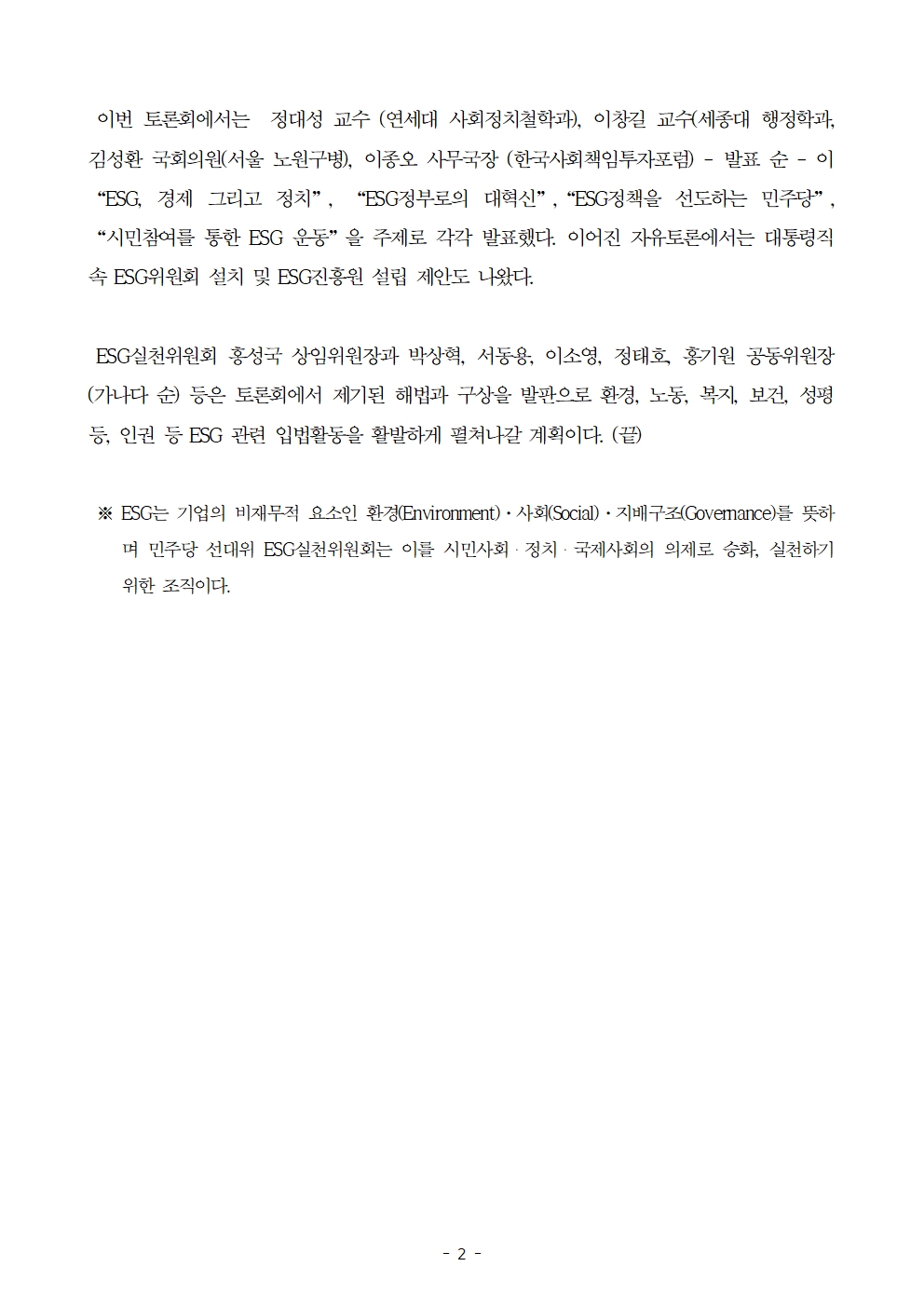 [보도자료] 더불어민주당 선대위 ESG실천위원회, 제2차 정책토론회에서 ESG정부 제안