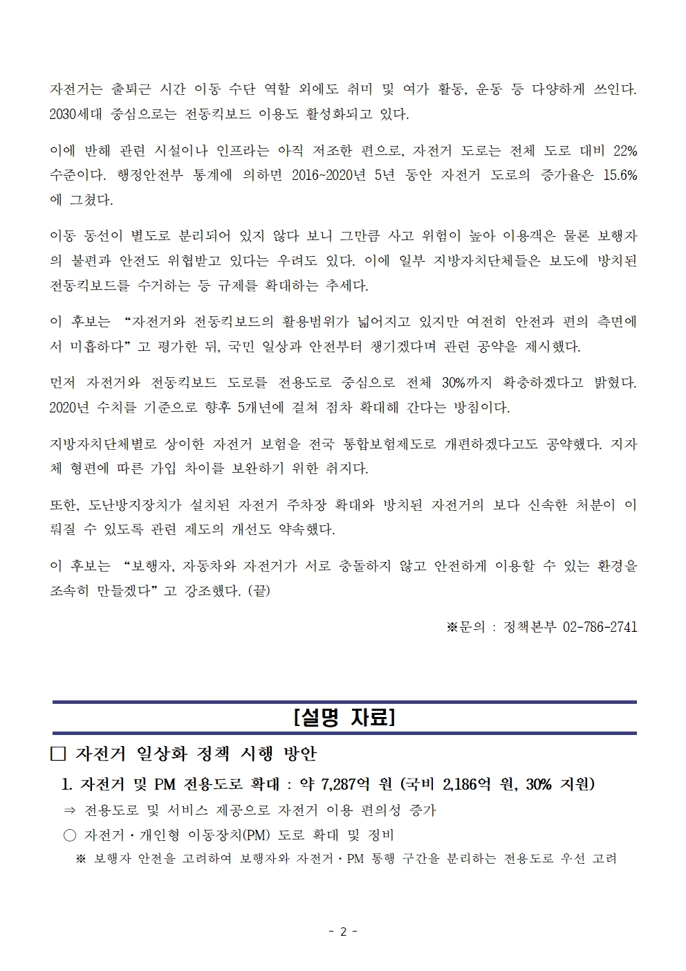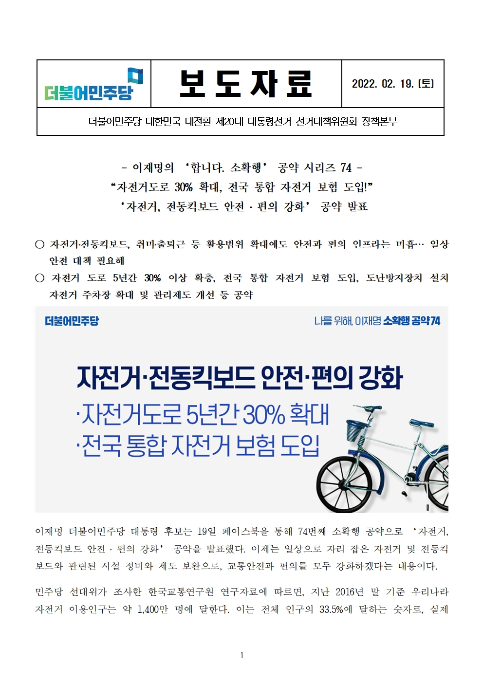 [보도자료] 더불어민주당 선대위 정책본부, '이재명은 합니다. 소확행 공약 시리즈 74' 자전거, 전동킥보드 안전 ․ 편의 강화 공약 발표 보도자료 홈페이지 게시